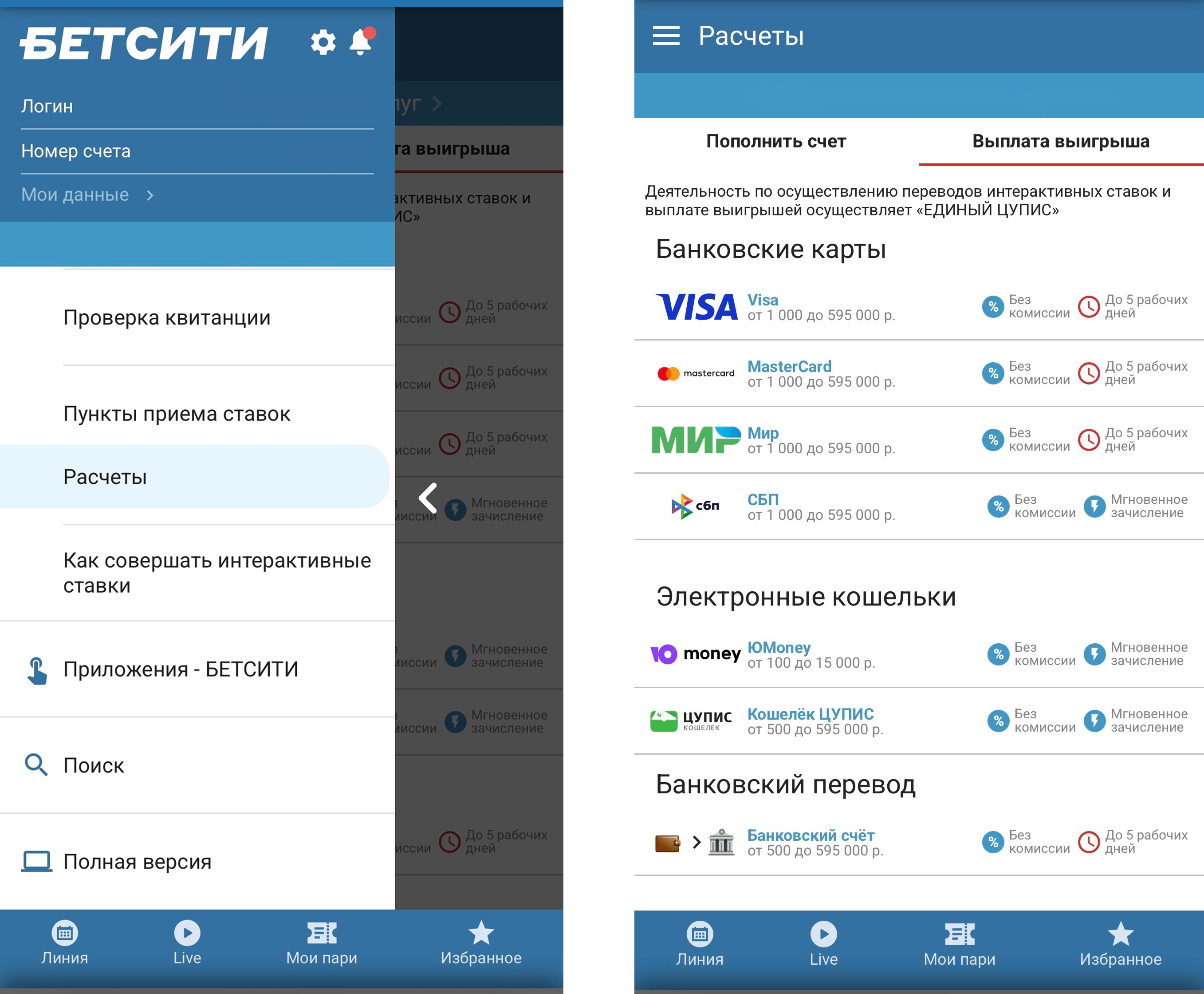 Что касается сроков вывода, то они, как и лимиты, зависят от выбранного способа вывода средств в «Бетсити». Так, при использовании банковских карт, а также банковского перевода, деньги могут идти на счет до пяти рабочих дней — но, как правило, средства зачисляются на счет в течение нескольких минут. Поступление средств на ЮMoney и кошелек ЦУПИС осуществляется мгновенно.