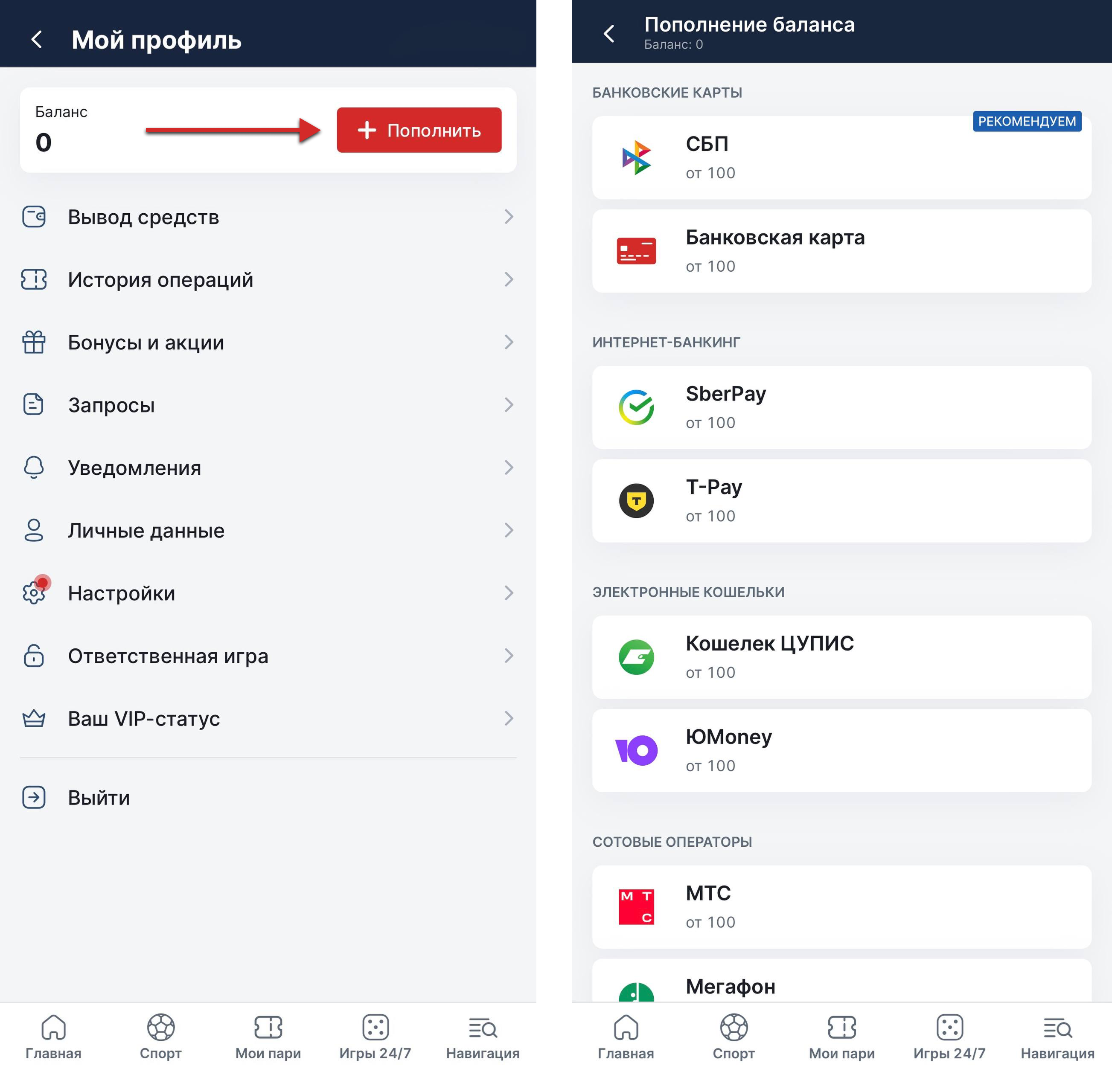 Приложение для электронных платежей СберPay — минимальная сумма пополнения 100 рублей, максимальная — 60 000 (при полной идентификации лимит увеличивается до 595 000 рублей), без комиссии со стороны букмекерской конторы.
