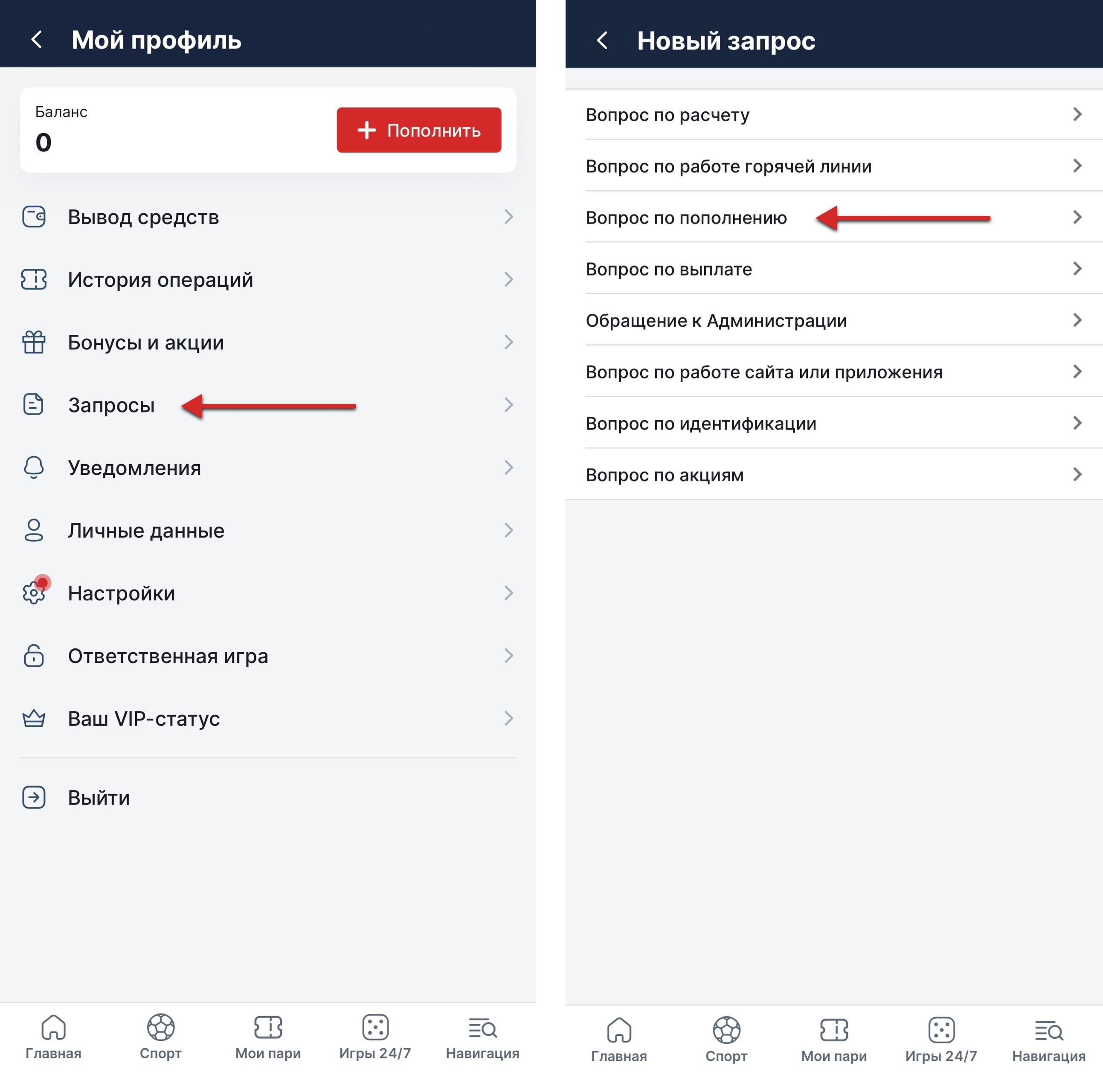 В строке выберите тип запроса «Вопрос по пополнению»;