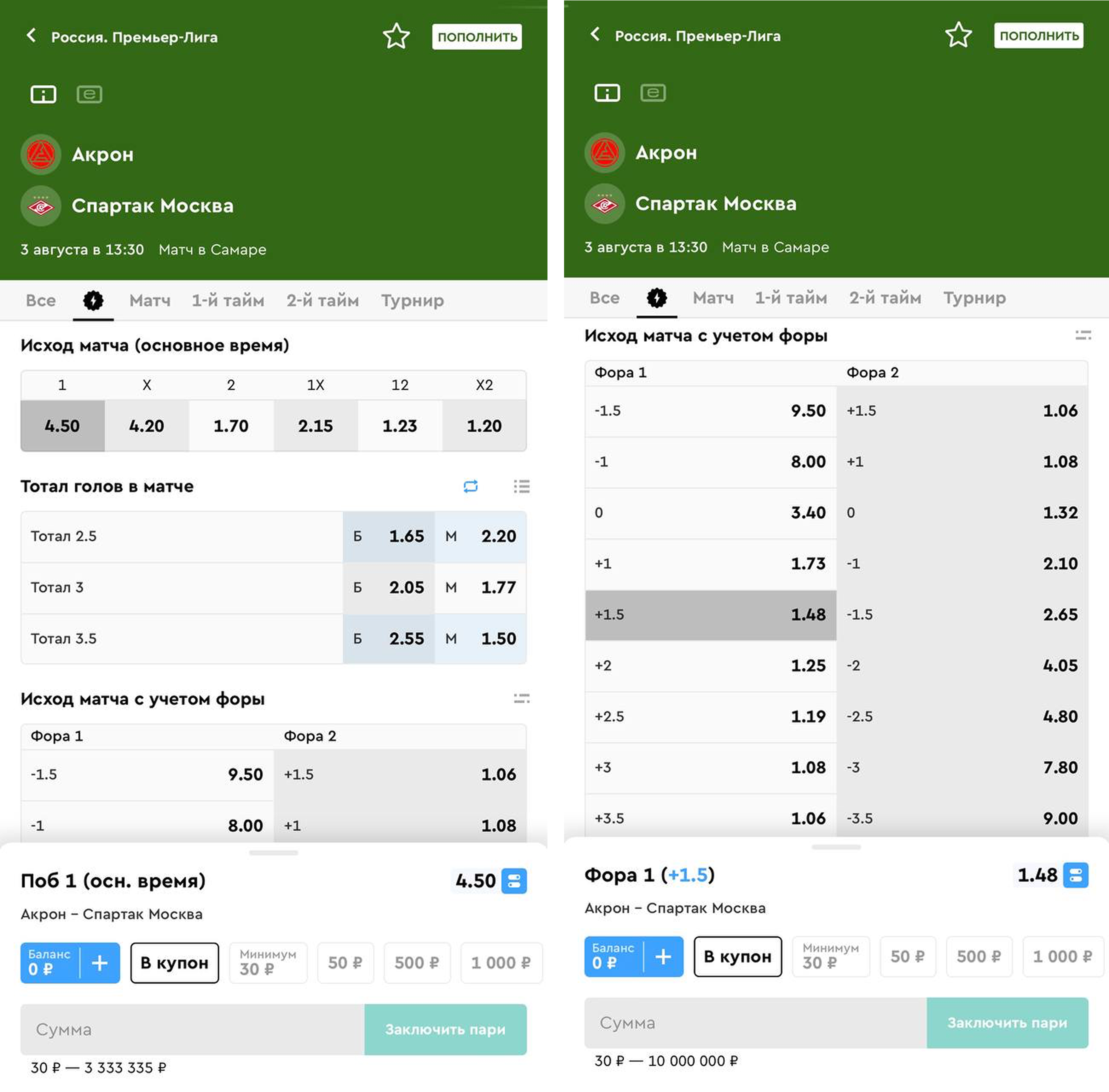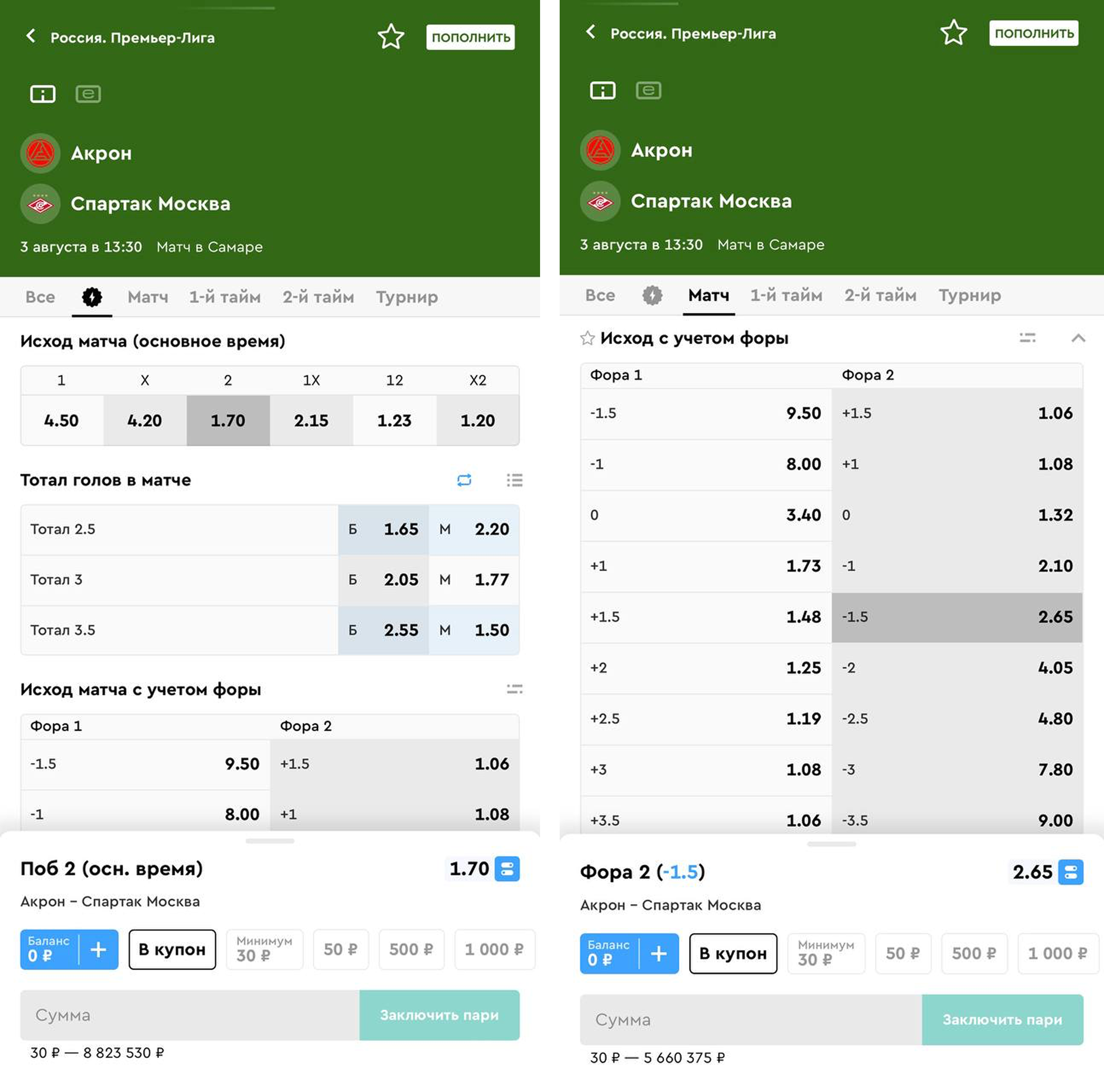 Вернемся к нашему примеру из матча «Акрона» и «Спартака». На победу хозяев коэффициент составляет 4.50. Выбирать победу аутсайдера рискованно, но если вы уверены, что команда способна дать бой и не будет разгромной победы фаворита, то можно выбрать вариант с победой хозяев с форой +1,5. Коэффициент в таком случае составит 1.48.
