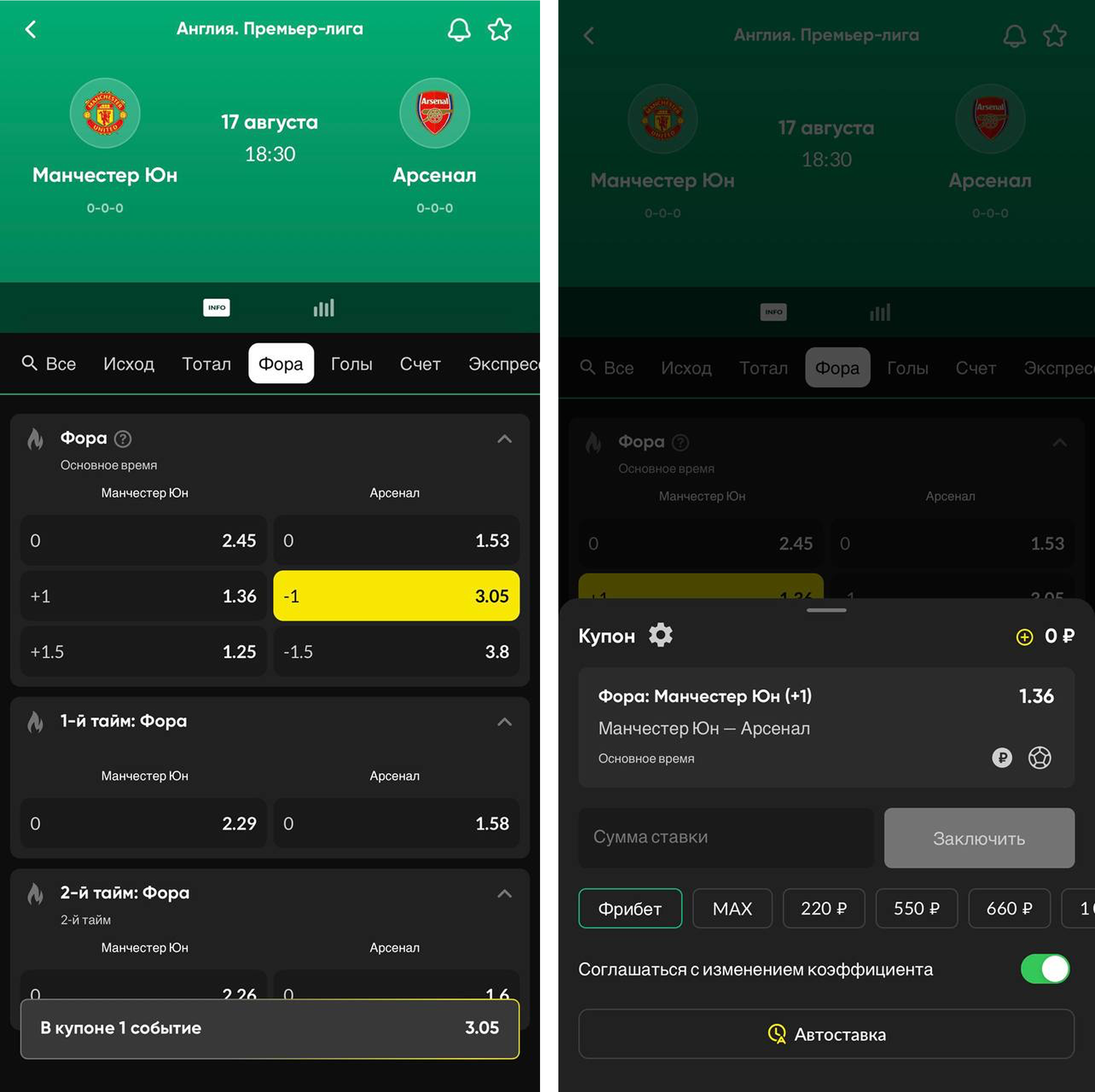 Для примера возьмем матч АПЛ между «Манчестер Юнайтед» и «Арсеналом». В линии есть Фора -1 на победу гостей с коэффициентом 3.05. В случае победы лондонцев в 1 гол, игрок получит возврат денег. Если «Арсенал» победит в 2 или более мяча, то ставка считается выигрышной. При ничье или проигрыше «Арсенала» игрок проиграет ставку.