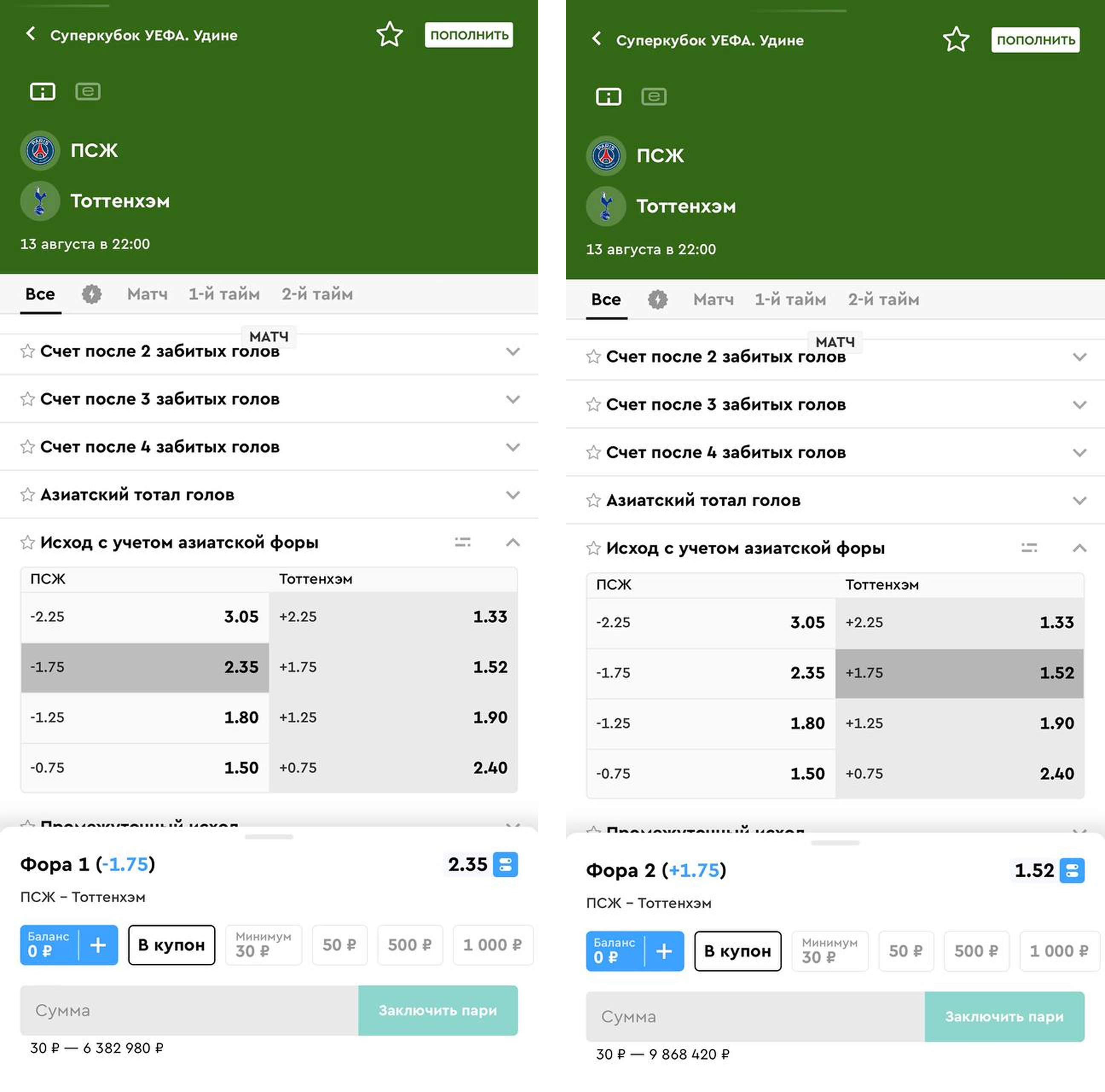 В матче Суперкубка УЕФА между «ПСЖ» и «Тоттенхэмом» предлагают коэффициент 2.35 на победу парижан с форой -1,75. При ставке в 1 000 рублей, будет заключено две ставки:
