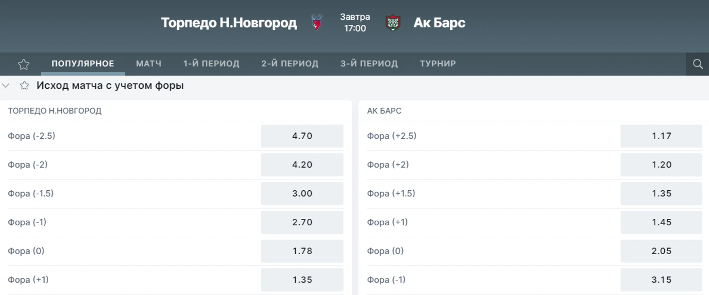 В качестве примера рассмотрим матч КХЛ «Торпедо» – «Ак Барс».