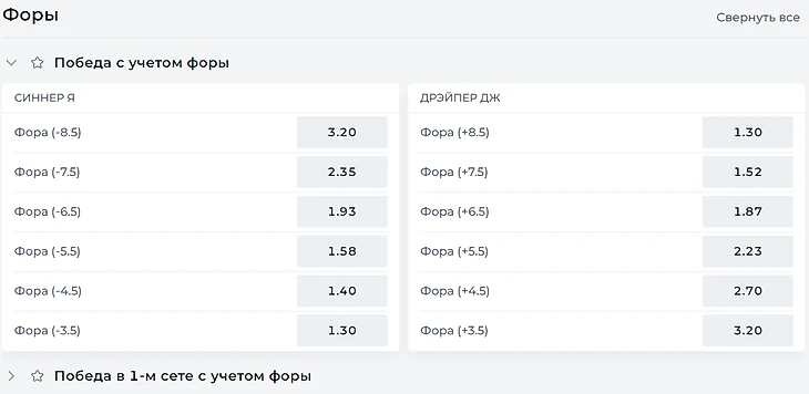 Самая популярная ставка с форой в теннисных матчах – на разницу по геймам. Рассмотрим матч между Кареном Хачановым и Джейком Дрейпером. Британец указан в линии вторым – в теннисе понятие «хозяин-гость» практически не применимо.