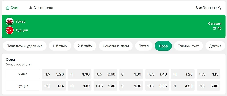 Для примера возьмем матч сборных Уэльса и Турции. Номинальными гостями являются турки, поэтому ставка фора 2 (1) касается именно их. Если беттер полностью уверен в победе Турции, но коэффициента 2.55 на этот исход ему мало, есть более рискованный вариант – Ф2 (-1) за 4.20. Предположим, что сумма ставки – 1000 рублей. Что может произойти далее: