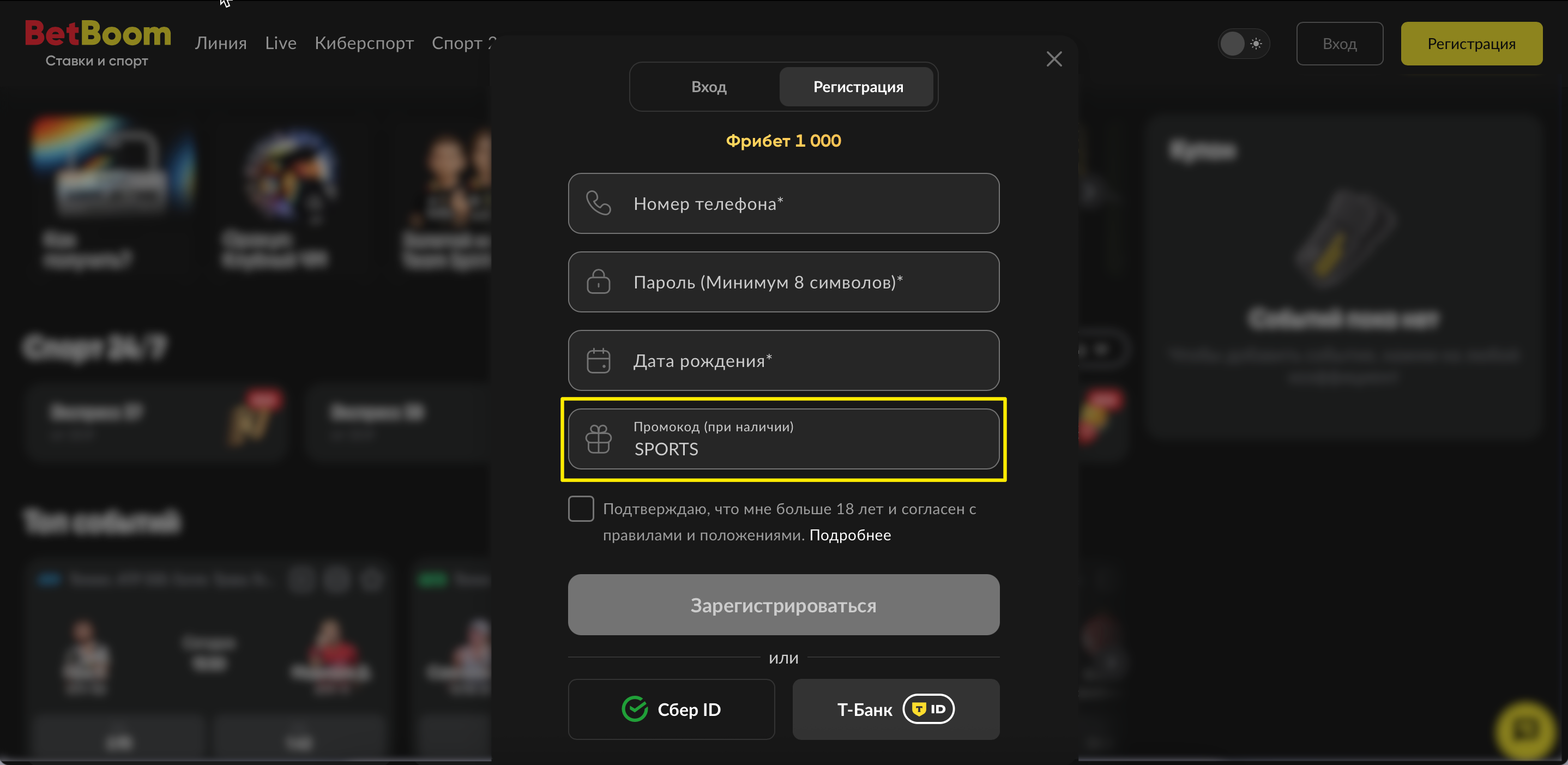 3. В строке «Промокод» впишите SPORTS. Это поможет вам получить фрибет.
