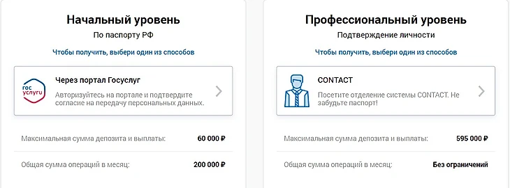 После полной идентификации максимальная сумма одной транзакции вырастет до 595 тыс. р. Лимит на месячную сумму операций будет снят.