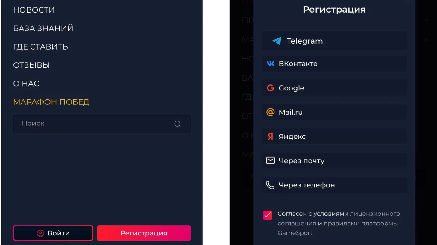 Для оплаты выбранного тарифа потребуется зарегистрироваться на сайте gamesport.com. Форма регистрации простая. Самый простой способ — регистрация по аккаунту в социальной сети: можно использовать Яндекс, Mail.ru, Google, VK, Telegram.