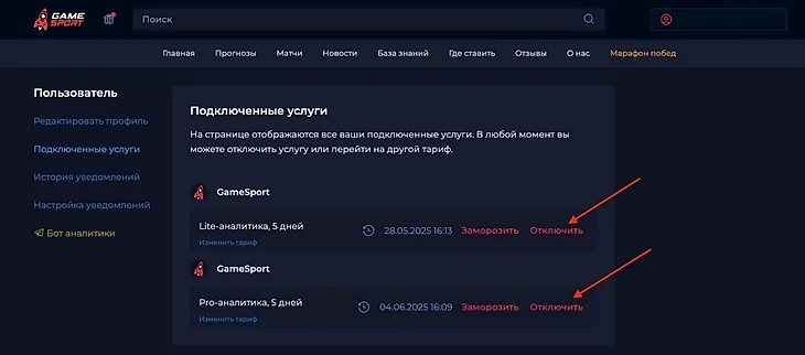 Для отмены тарифа необходимо перейти в личный кабинет подключенные услуги и нажать на крестик возле выбранной подписки. Также можно обратиться в службу поддержки. Контакты для связи: адрес электронной почты support@gamesport.com и Telegram @GameSportSupportBot.