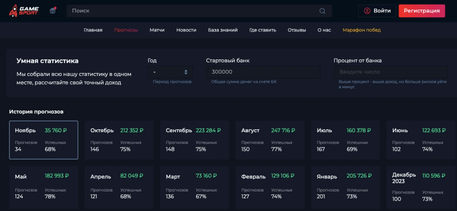 У портала GameSport средний процент проходимости прогнозов на отметке 75-80%. Это нормальный показатель для выхода в плюс на дистанции. Также это свидетельствует о честности каппера. Нет слишком красивой статистики с процентом проходимости от 90 и выше.