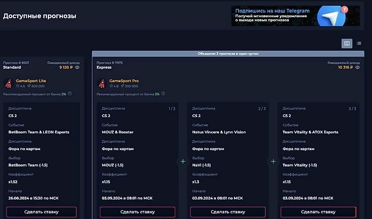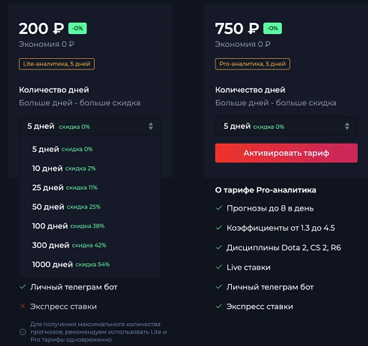 На тарифе Pro-аналитика периодически публикуют экспресс-прогнозы. На тарифе Lite-аналитика нет экспресс-ставок.