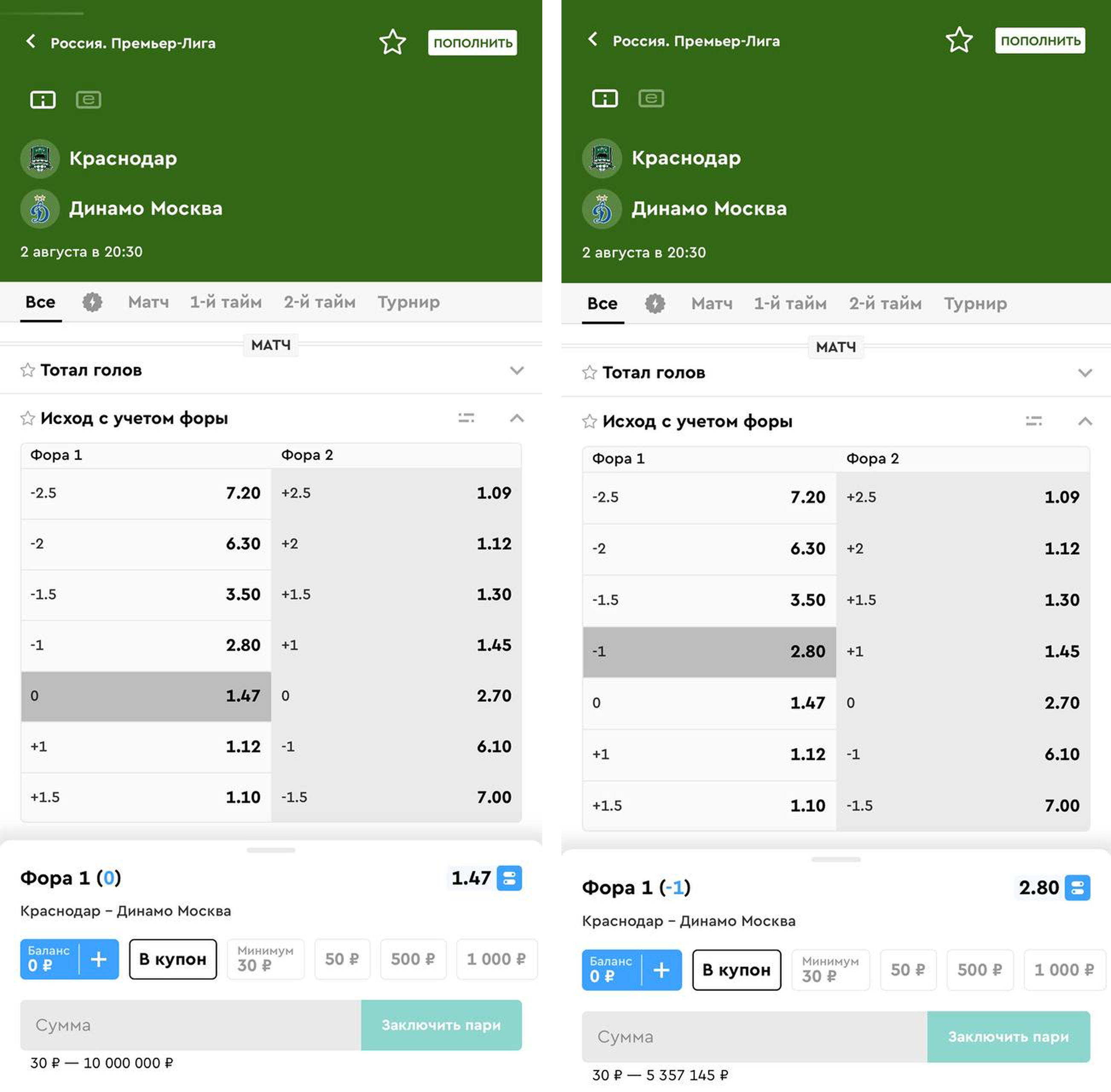 Например, мы заключаем пари на победу «Краснодара» с нулевой форой в матче против «Динамо».