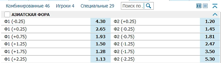 Сделать ставку с форой (0,25) можно на любого из участников матча. Поскольку она бывает плюсовой и минусовой, то обычно букмекеры в линии дают 4 варианта такого гандикапа на матч: