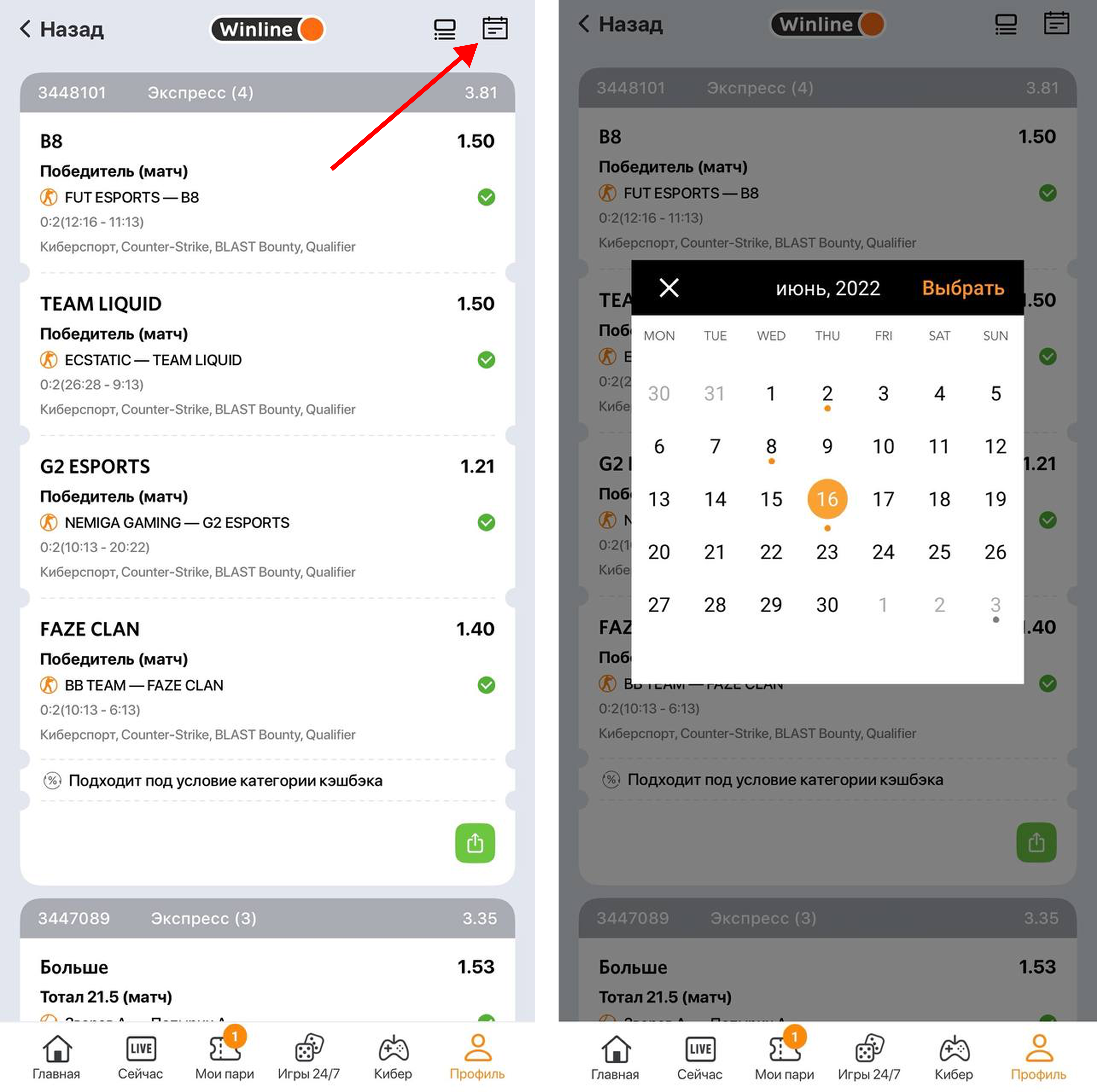 Для поиска более давних заключенных пари воспользуйтесь историей или фунцией календаря в своем профиле.