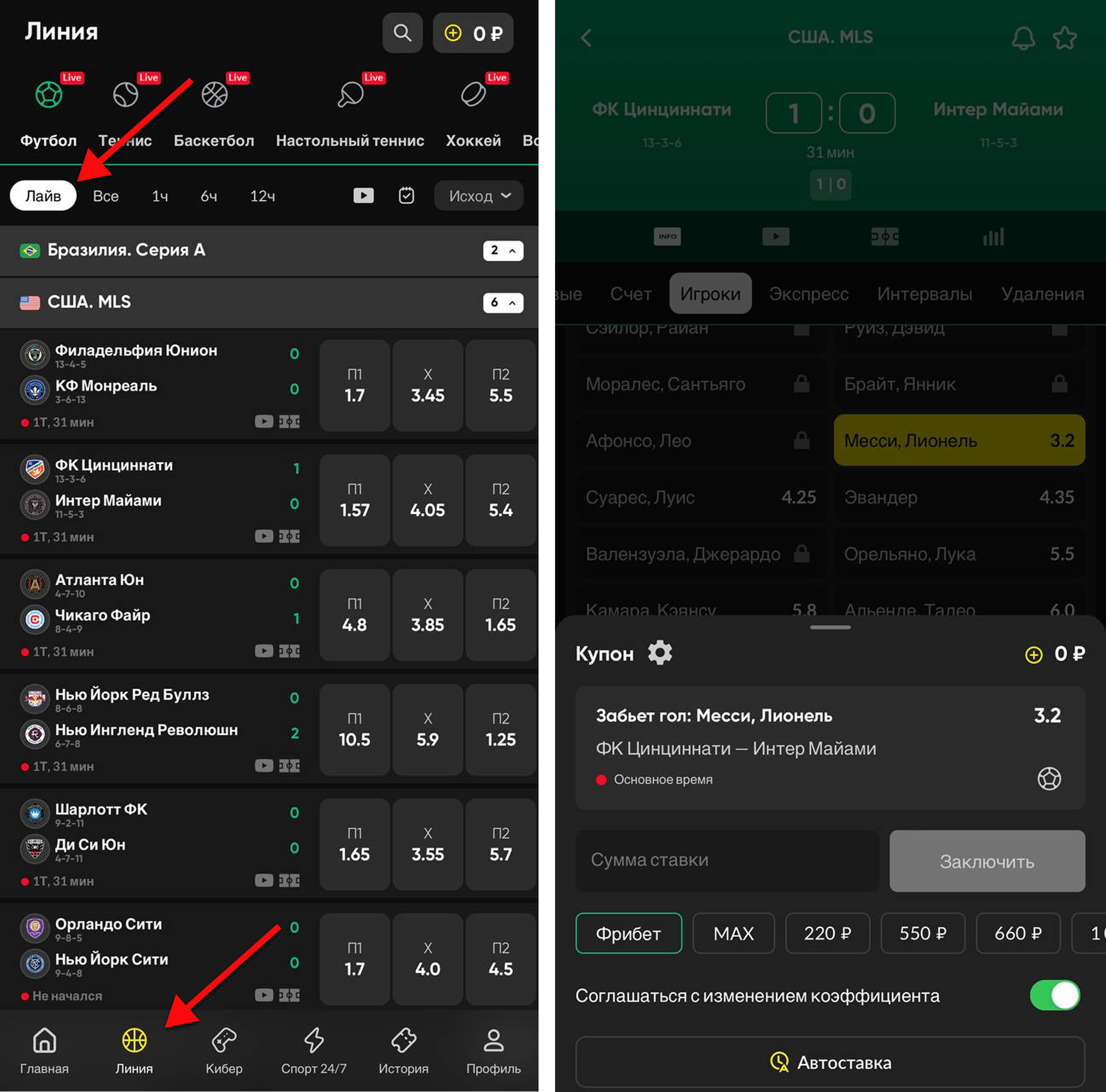 Показываем, как заключить live-пари на спорт в мобильной версии или приложении любой легальной букмекерской компании: