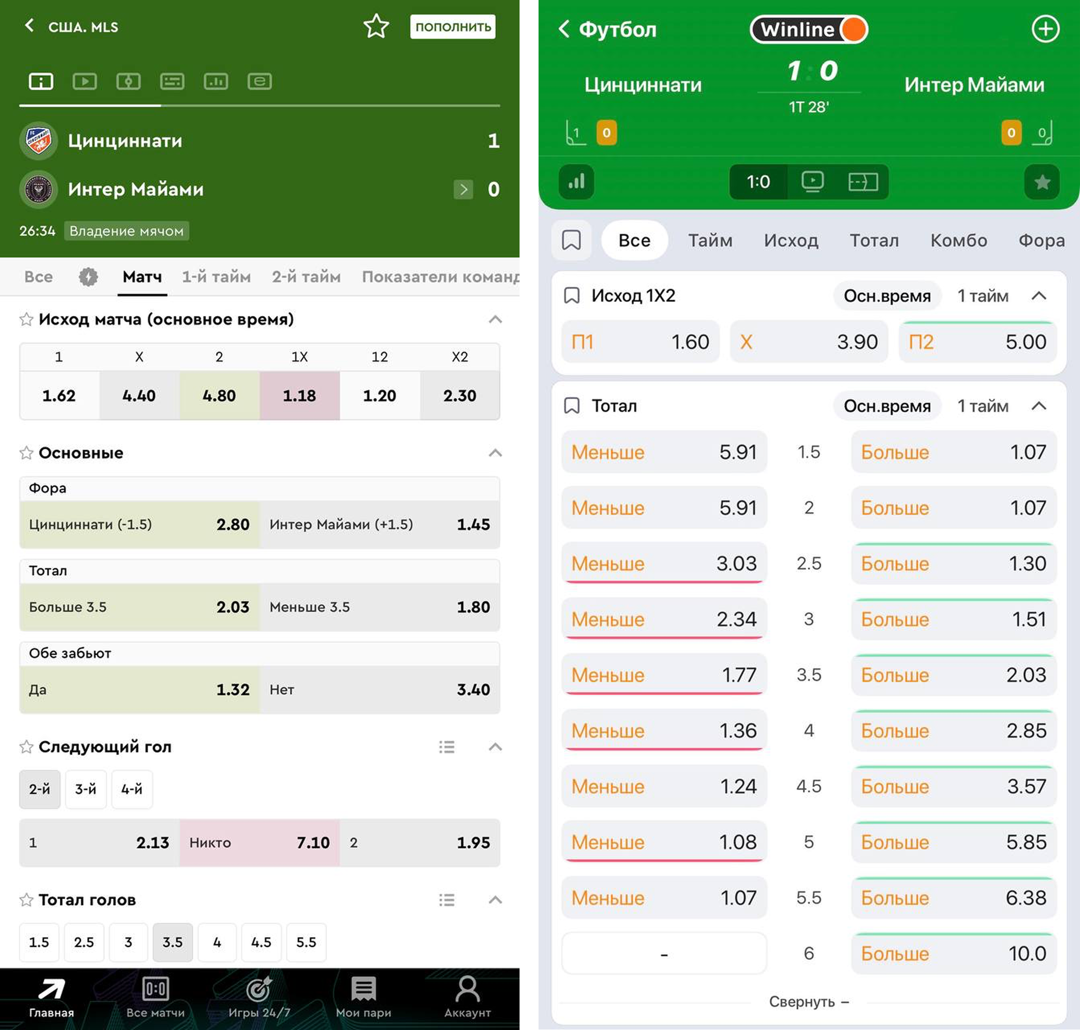 ход игры: в зависимости от промежуточного результата встречи меняются коэффициенты на исход;
