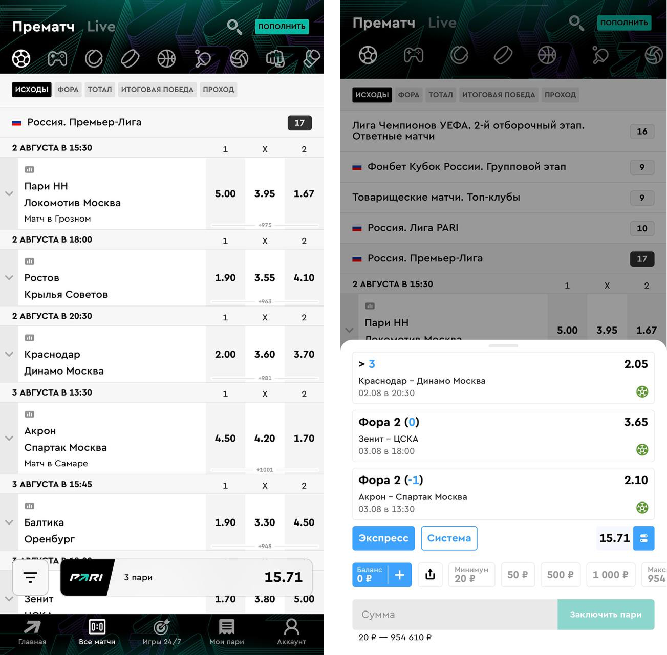 Экспресс — ставка на несколько событий в рамках одного купона. В купон можно добавить от двух независимых друг от друга матчей. Для выигрыша необходимо угадать все исходы, добавленные в купон. При одной или более ошибках ставка считается проигранной.