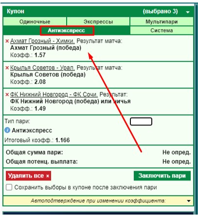 Антиэкспресс — вид ставки на два или более события, где вы одержите победу, если ошибетесь как минимум в одном результате.