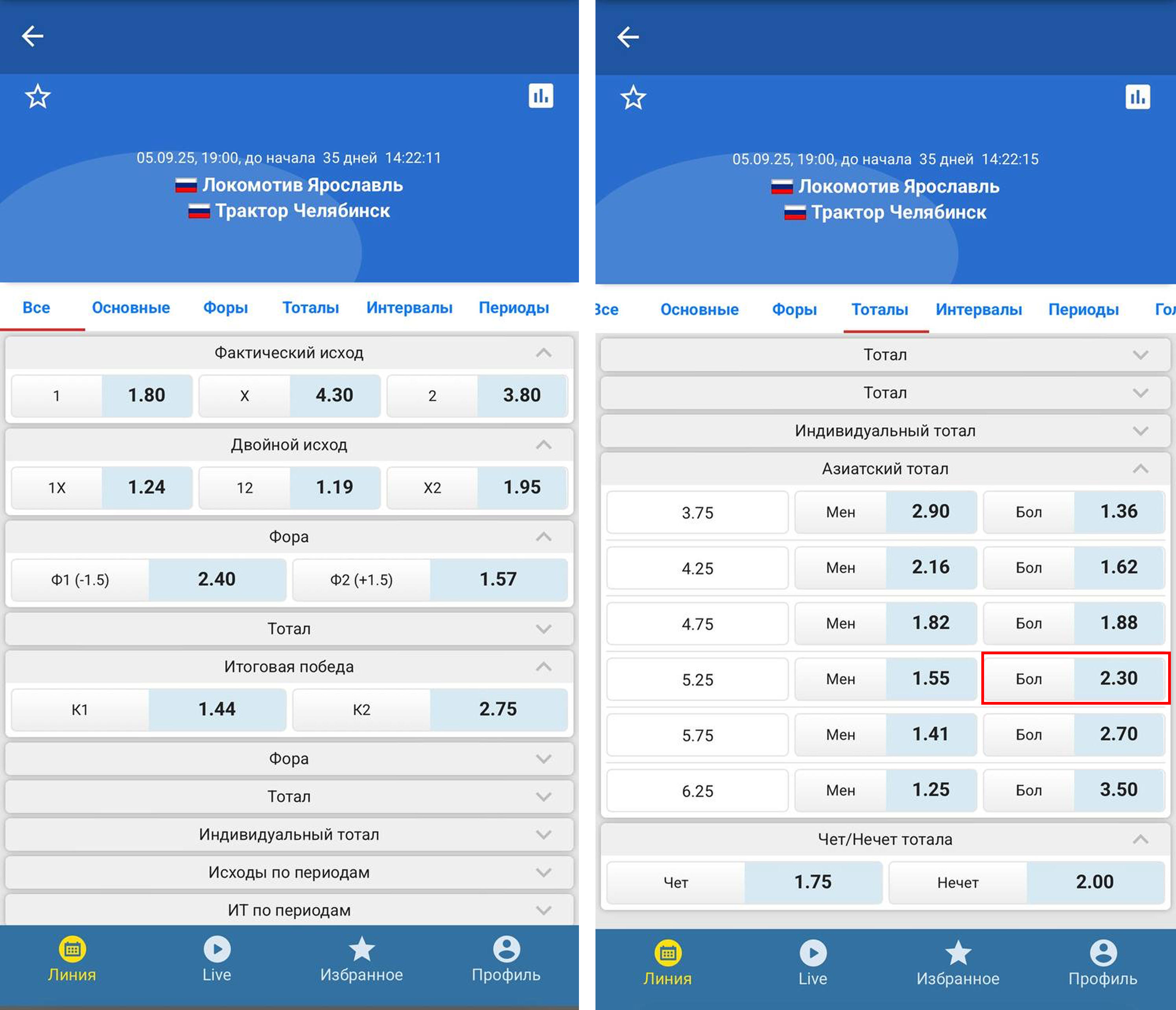 Принцип расчета азиатского тотала на шайбы в хоккее такой же, как на голы в футболе. Например, в матче регулярного чемпионата КХЛ «Локомотив» – «Трактор» мы ставим на ТБ 5,25 за коэффициент 2.30. Сумма – 1 000 рублей., которая делится пополам (по 500 рублей) на два пари: ТБ 5,0 и ТБ 5,5.