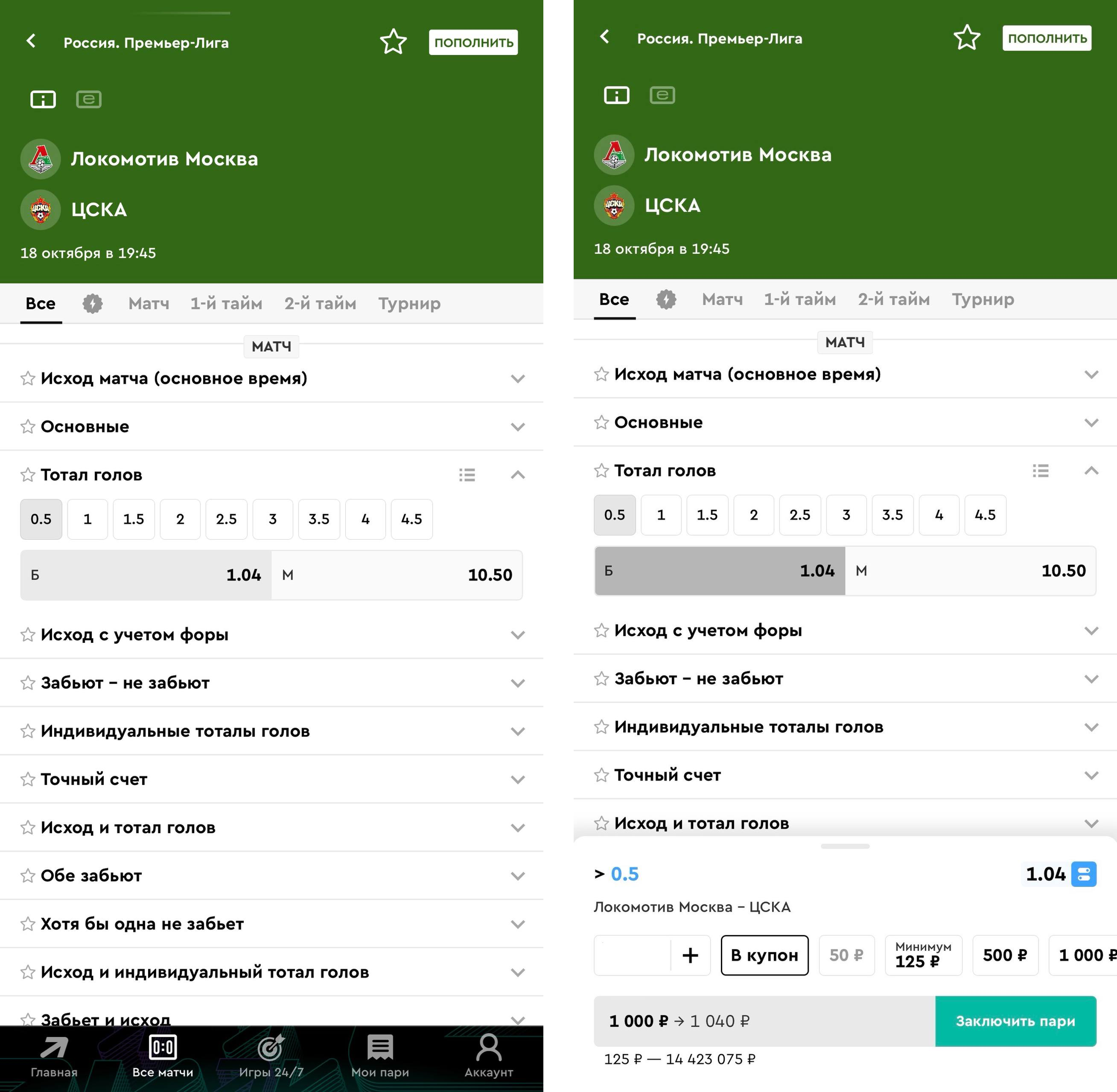 Перейдя в нужный раздел, необходимо нажать на коэффициент напротив ТБ 0,5. В купоне указать сумму ставки и подтвердить операцию.