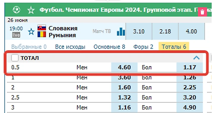 При выборе ТБ 0,5 игрок предполагает, что в матче или на отдельном отрезке игры произойдет какое-то действие: гол, угловой, очко, удаление и так далее. Чтобы понять механику расчета пари, за основу возьмем игру Евро 2024 Словакия — Румыния.
