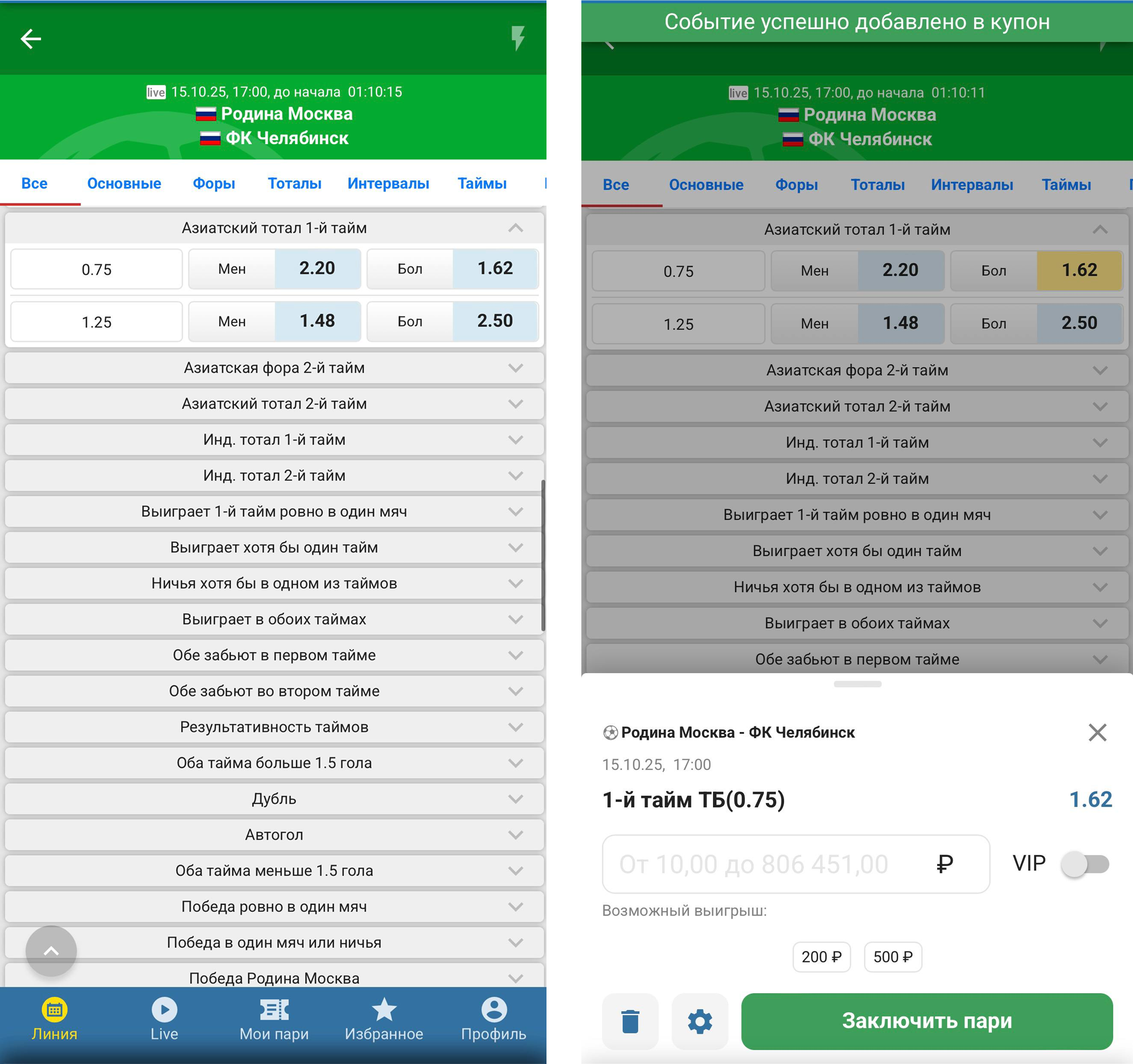 Пример ставки ТБ 0,75 в первом тайме на матч «Родина» — «Челябинск». Коэффициент на выбранный исход — 1,62. Ставка в 1000 рублей может превратиться: