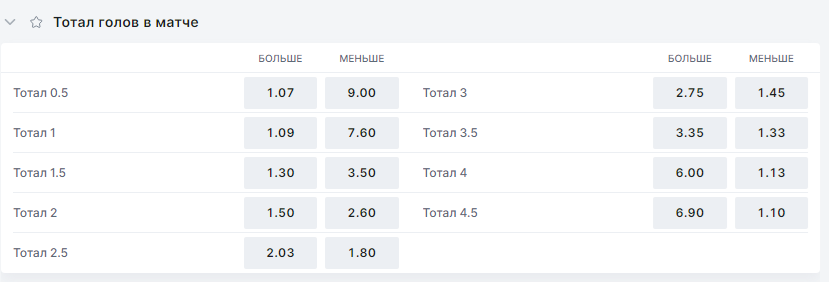 Выбираем матч Испания — Германия. Тотал больше 4,5 в линии идет с кэфом 6.90. Пари выиграет, если команды суммарно забьют в основное время пять и более голов. Для футбола игра с пятью и более мячами считается крайне результативным матчем, поэтому букмекеры и предлагают высокие коэффициент.
