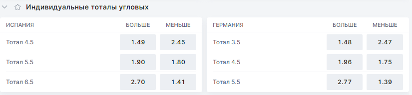 В том же матче беттор можно заключить пари на количество угловых одной из команд. Ставка выиграет, если, например, Испания подаст пять и более угловых. Кэф на такой исход — 1.49.