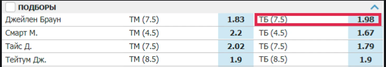 Например, на ТБ 7,5 подборов Джейлена Брауна коэффициент 1.98. Если игрок совершил 8 подборов, то беттер получит выигрыш. Если у Брауна за матч 7 или менее подборов, то ставка проиграет.