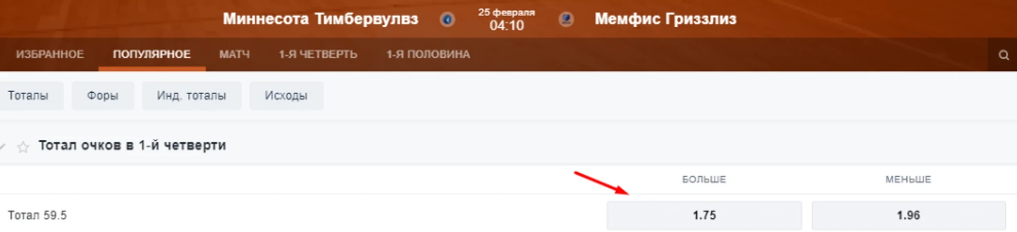 Классический тотал может быть рассчитан по итогам матча или на результативность конкретной четверти, например, первой. Ниже представлен скрин варианта такого пари.
