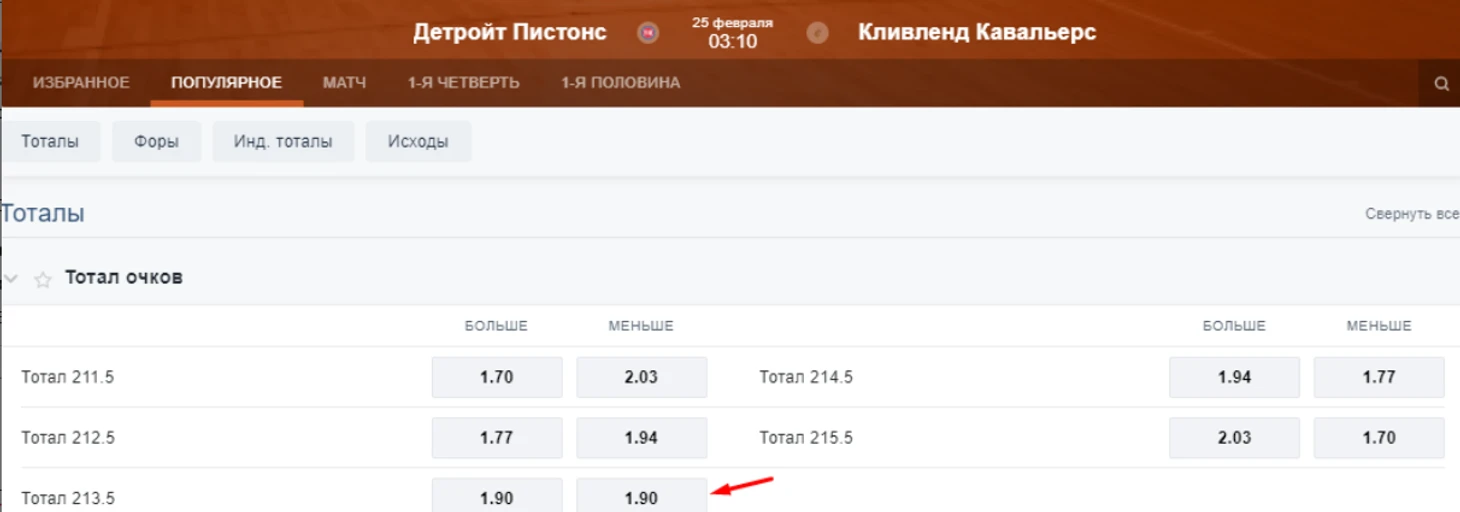 При ставке на ТБ 213,5 на матч по НБА доступны два варианта расчета: