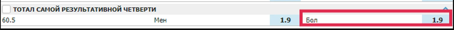 У ставок на тотал четверти есть подвид. Игрок выбирает не тотал конкретного отрезка, а тотал самого результативного периода встречи. Пари называется «тотал самой результативной четверти».