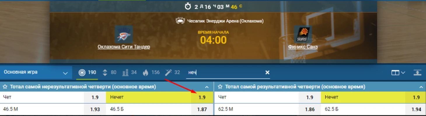Ставить на чет/нечет можно на итоги матча, половину и четверти. Некоторые БК предлагают пари на чет/нечет самой результативной игры матча.