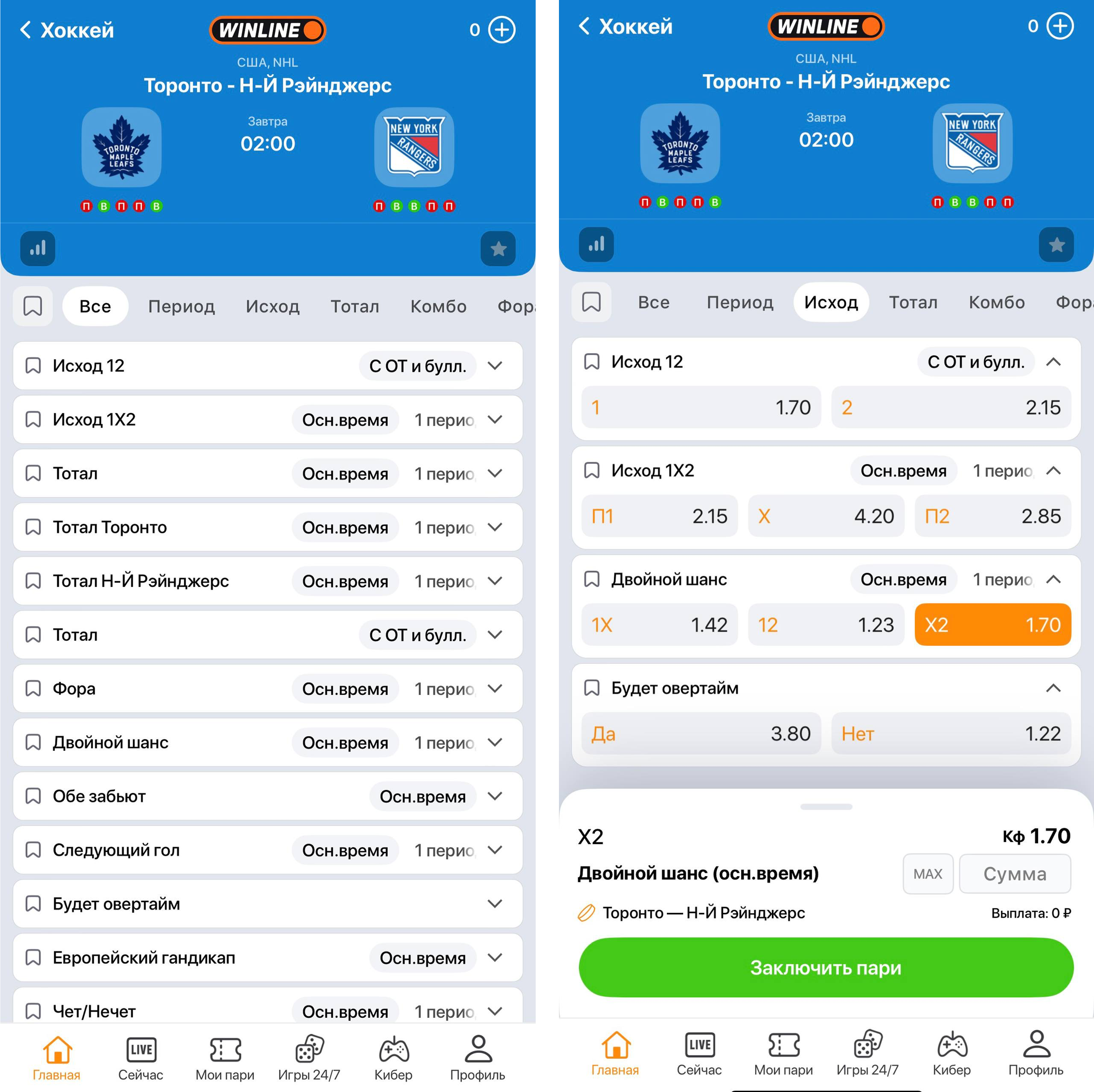 Пример. В матче НХЛ «Торонто» — «Рейнджерс» сделана ставка на фору 2 (+0,5) с коэффициентом 1.70 Чтобы ставка принесла деньги игроку, гости должны победить в основное время с любым счетом или сыграть вничью. При победе «Торонто» в основное время ставка будет считаться проигранной.