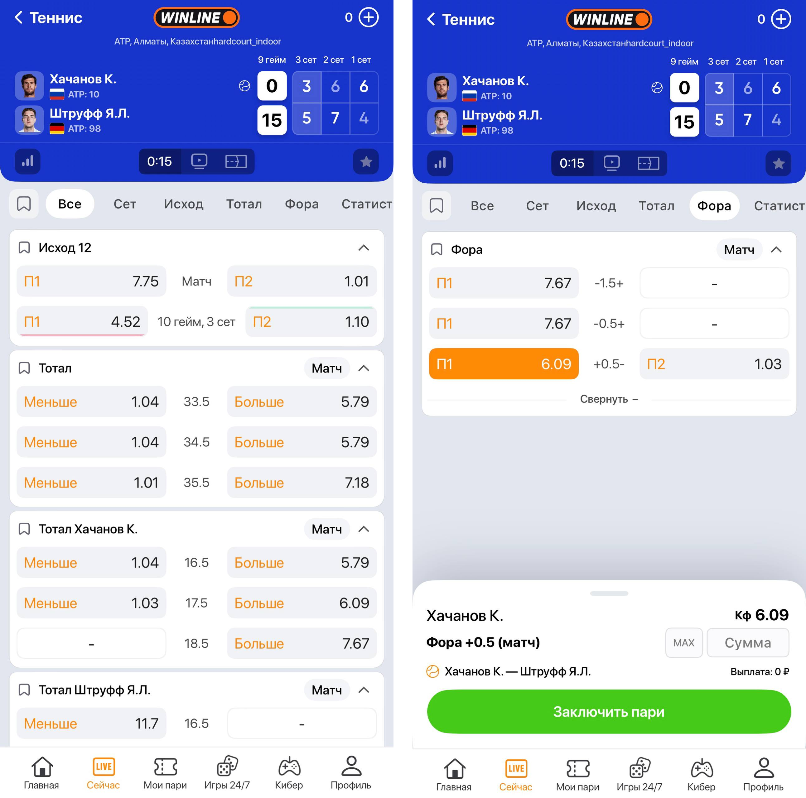 Пример. Матч Хазанов — Штраф на турнире в Алматы. Игрок выбрал ставку Ф1 (+0,5) по геймам с коэффициентом 6.09, она сыграет, если Хазанов наберет больше геймов, чем Штруфф. При этом российскому теннисисту не обязательно побеждать в матче – например, ставка пройдет при счете 6:4, 6:7, 6:7 в пользу немца (счет по геймам будет 18:18).
