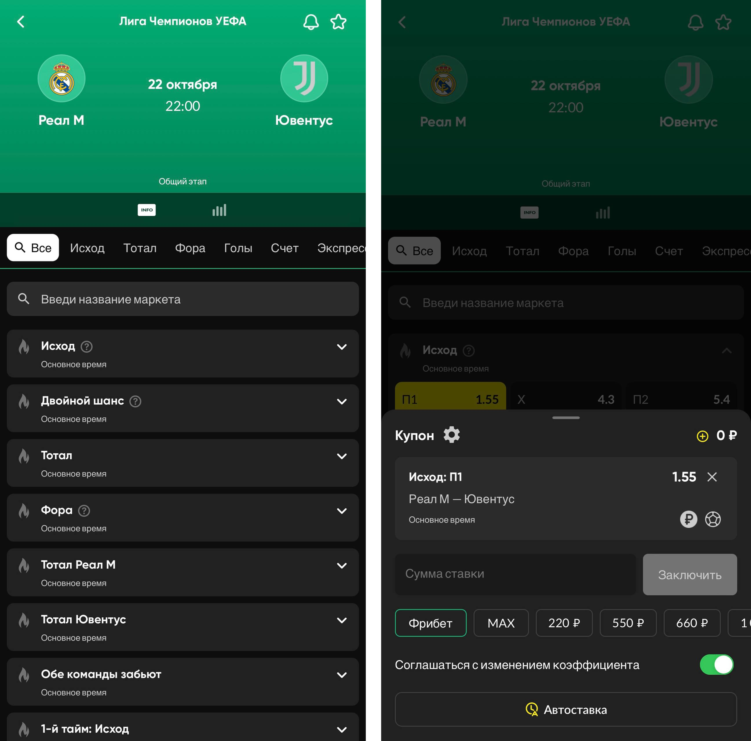 Пример. В матче Лиги чемпионов «Реал» — «Ювентус» игрок выбрал ставку на фору 1 (-0,5) с коэффициентом 1.55. Пари сыграет, если хозяева одержат победу с любым счетом. То есть эта ставка полностью равносильна варианту «Победа 1 команды» /« П1» в основное время