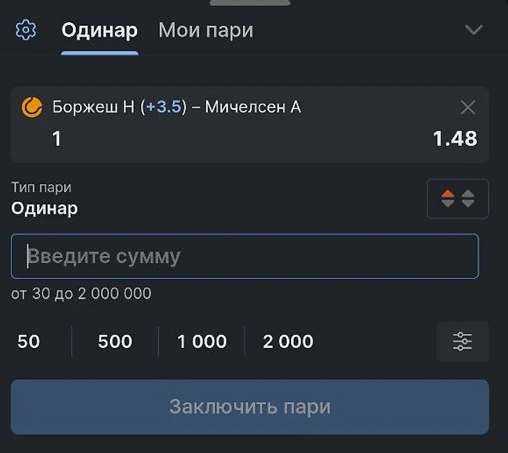 Пример №2. Ставка с форой 1 (+3,5) на матч Нуну Боржеш — Алекс Микелсен. Пари сыграет, если Боржеш уступит не более чем в 3 гейма. Встреча заканчивается победой Нуну — 7:6, 0:6, 7:6. Считаем количество набранных геймов — 14:18 в пользу Микелсена. Ставка проиграла.