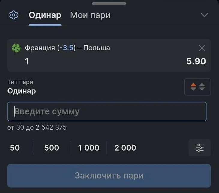Пример №1. В матче Евро-2024 между Францией и Польшей игрок заключает пари на Ф1 (-3,5) с коэффициентом 5.90. Пари сыграет, если французы одержат победу с разницей в 4 и более гола.