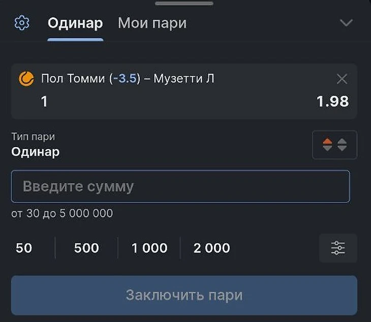 Пример №1. Беттор делает ставку Ф1 (-3,5) на матч Томми Пол — Лоренцо Музетти. Матч заканчивается волевой победой первого игрока — 3:6, 6:4, 6:4. Пол набрал 15 геймов, а Музетти — 14. Отнимем гандикап (3,5) от результата Томми и получаем, что с учетом форы итоговый счет по геймам — 11.5 на 14 в пользу Музетти. Ставка проиграла.