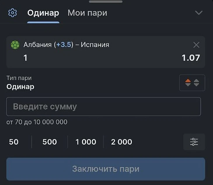 Пример №3. В поединке ЧЕ-2024 между Албанией и Испанией беттор заключает пари на Ф1 (+3,5) с коэффициентом 1.07. Для совпадения ставки албанцам достаточно проиграть не более чем в 3 мяча.