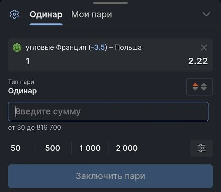 Пример №2. В том же матче Франция — Польша беттор ставит Ф1 (-3,5) по угловым за кэф 2.22. Пари выиграет, если французы превзойдут поляков по количеству поданных угловых на 4 и более. При этом результат поединка не имеет значения для прохода пари.