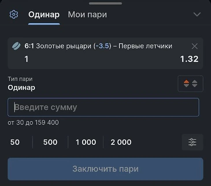 Пример №1. В матче по шорт-хоккею между командами «Золотые рыцари» и «Первые летчики» игрок делает live-ставку Ф1 (-3,5) на матч с коэффициентом 1.32 при счете 6:1. Пари выиграет, если первая команда удержит преимущество хотя бы в 4 шайбы.