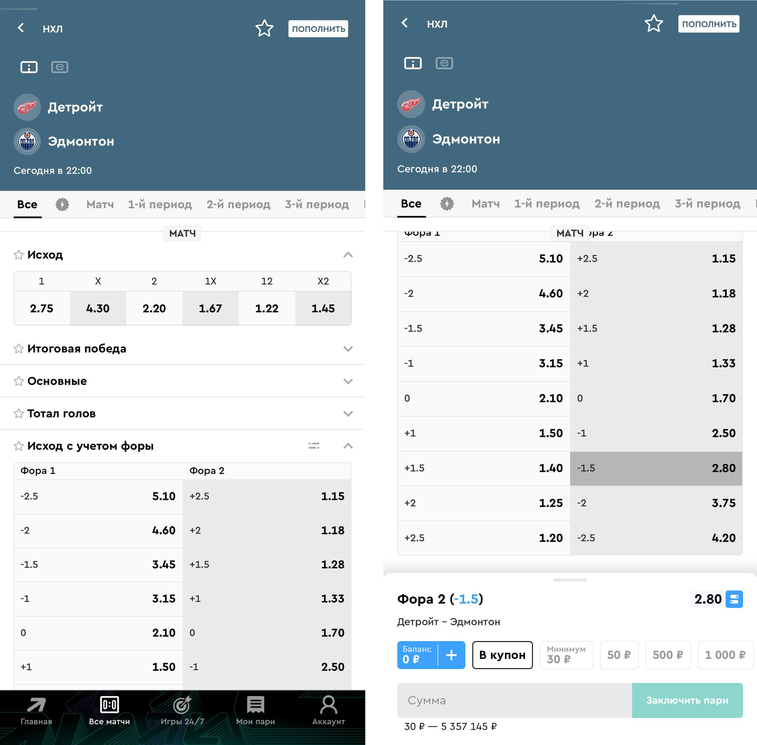 Пример. Рассмотрим матч между Детройтом и Эдмонтоном. Игрок заключает пари Ф2 (-1,5) с коэффициентом 2.80. Пари сыграет, если «Ойлерз» одержат победу с разницей в 2 и более гола.