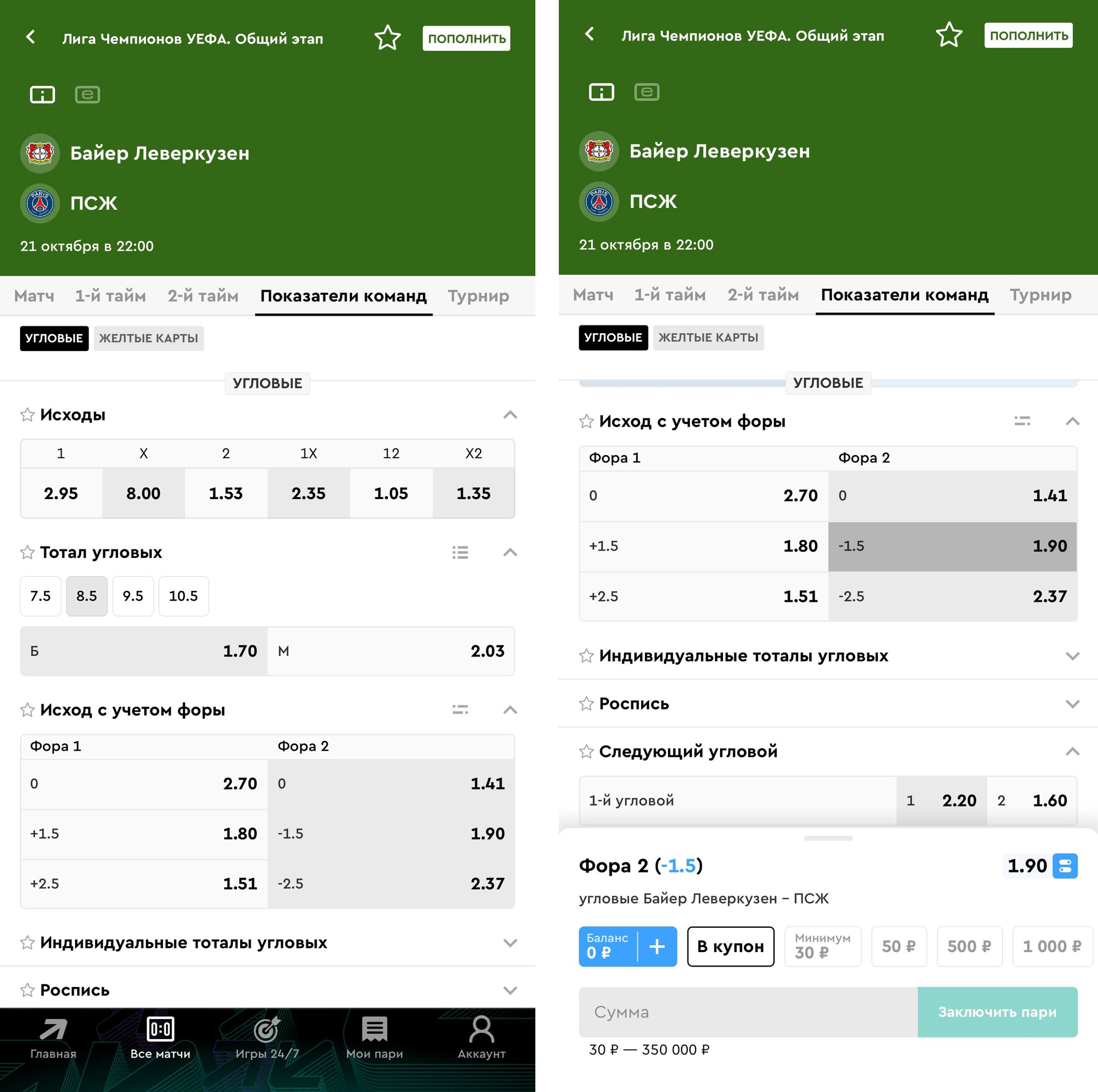 Пример №2. Игрок делает ставку Ф2 (-1,5) по угловым с коэффициентом 1.90. Пари сыграет, если игроки «ПСЖ» за основное время матча подадут минимум на 2 угловых больше, чем противники.