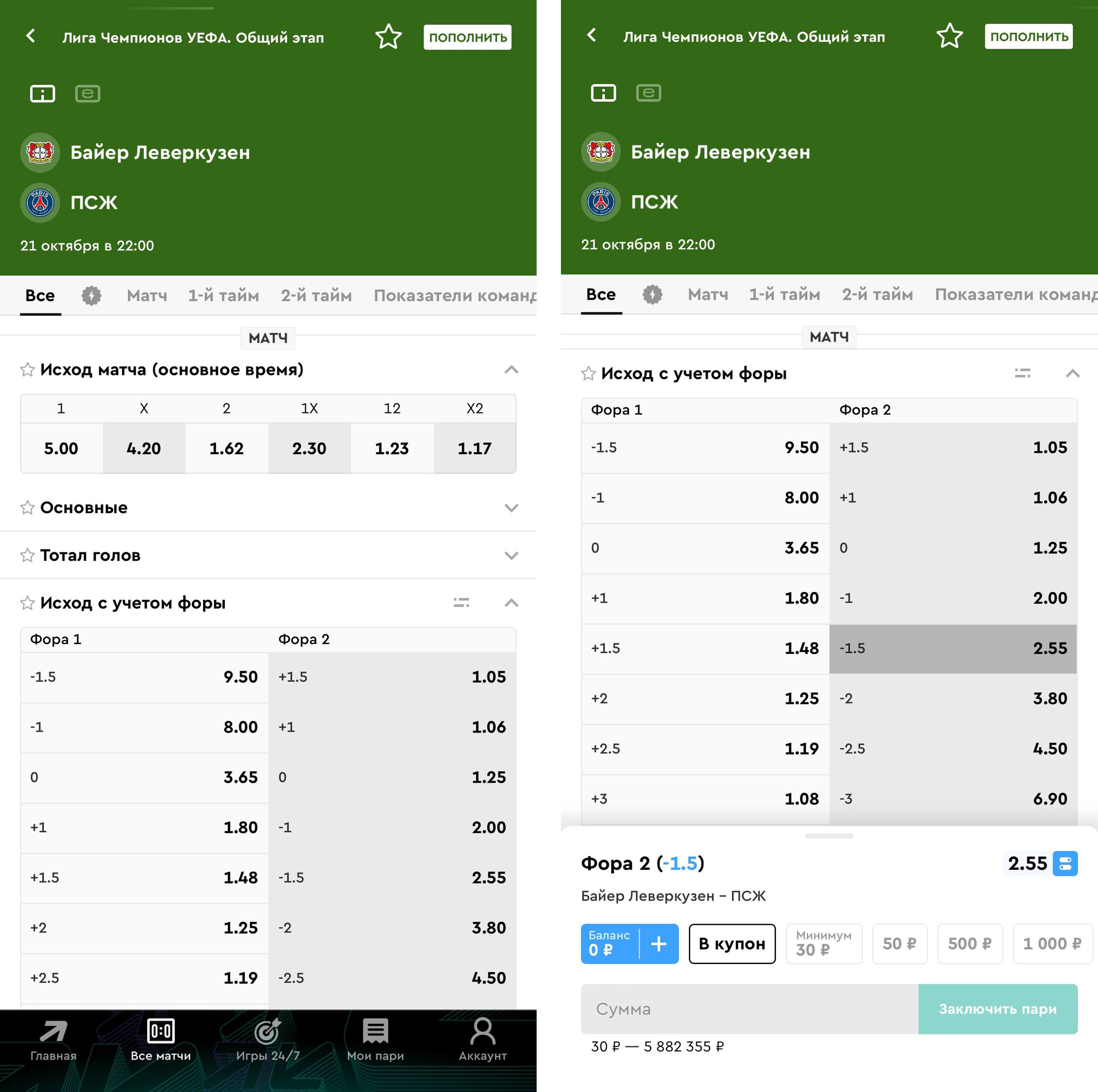 Рассмотрим ставки на минусовую и плюсовую фору на примере матча Лиги чемпионов «Байер» – «ПСЖ».