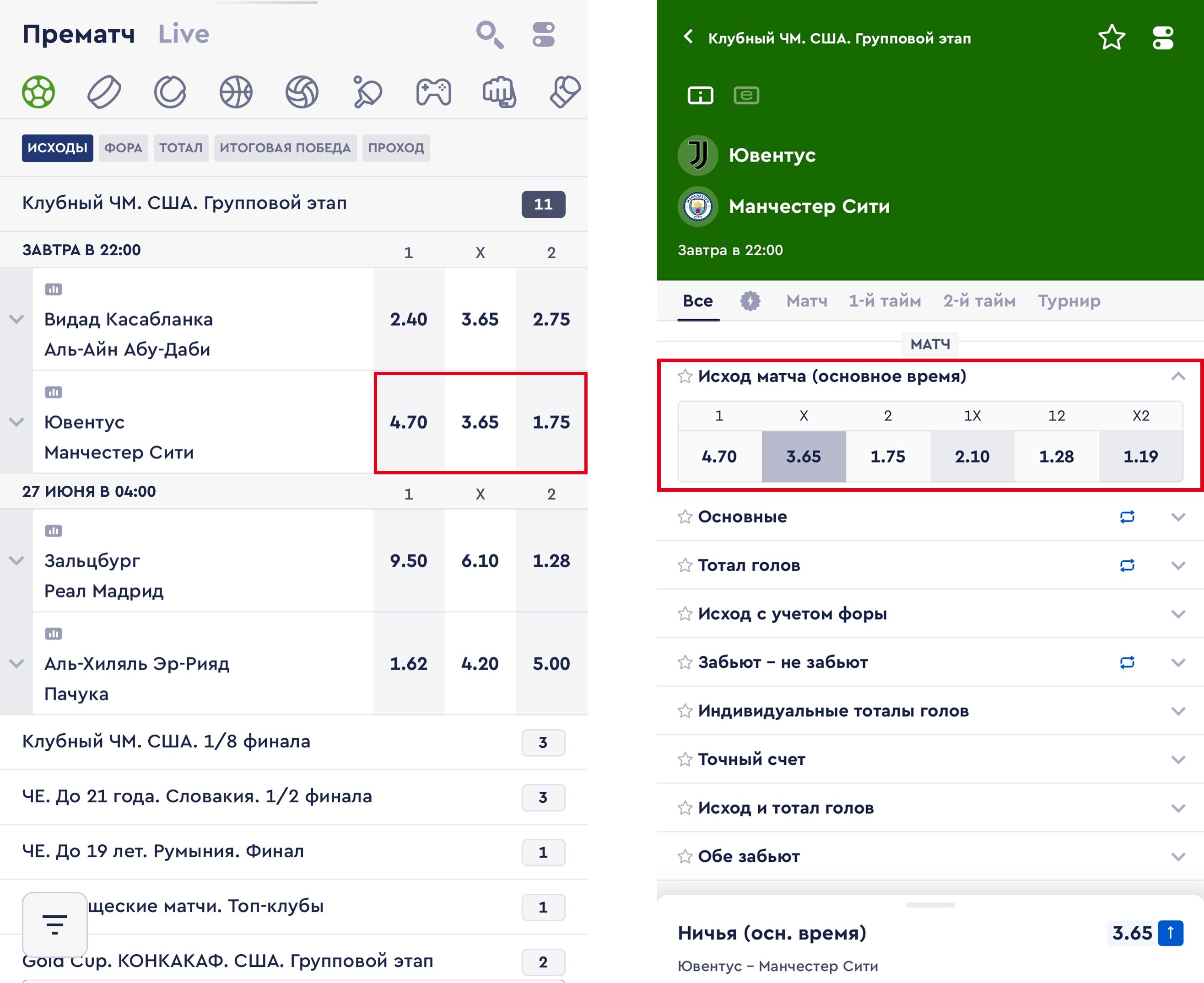 Основной рынок – это список событий, представленных на страницах «Линии» и «Лайва». Это основные спортивные события, на которые можно делать ставки.