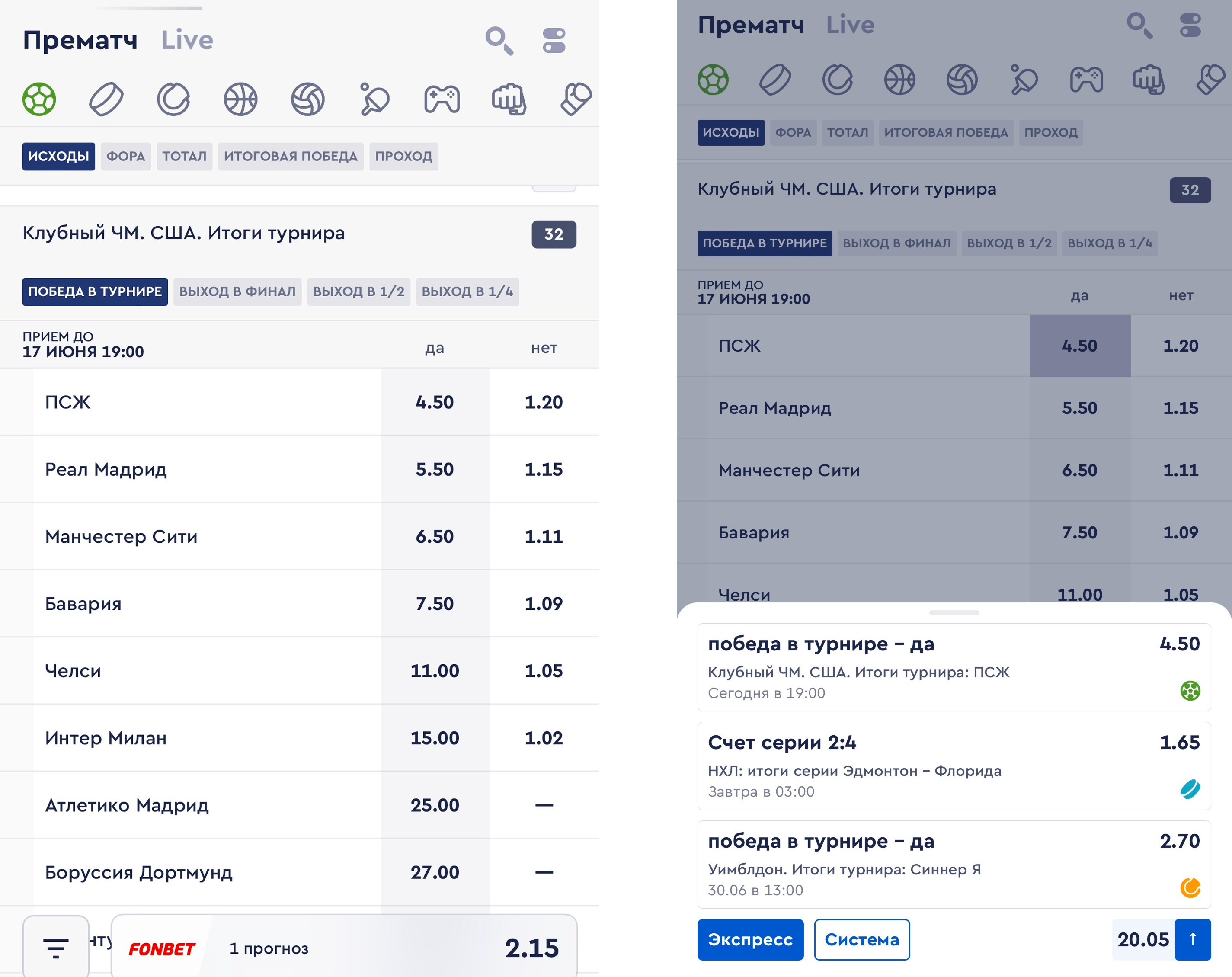 Теперь рассмотрим, как сделать экспресс-ставку в мобильной версии сайта или в приложении «Фонбет»: