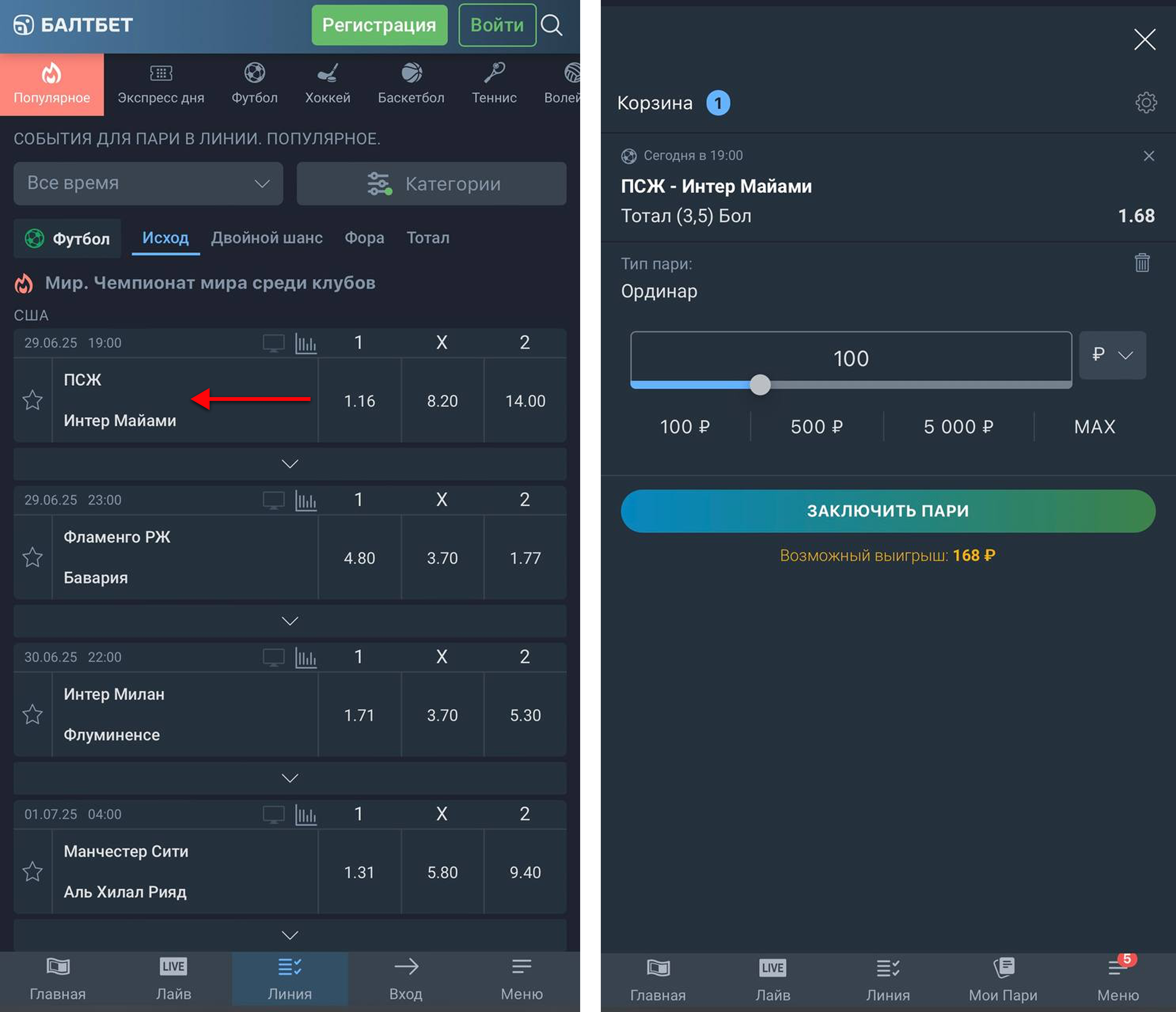 Нажмите на коэффициент, соответствующий вашему выбору (например, победа команды «А»).