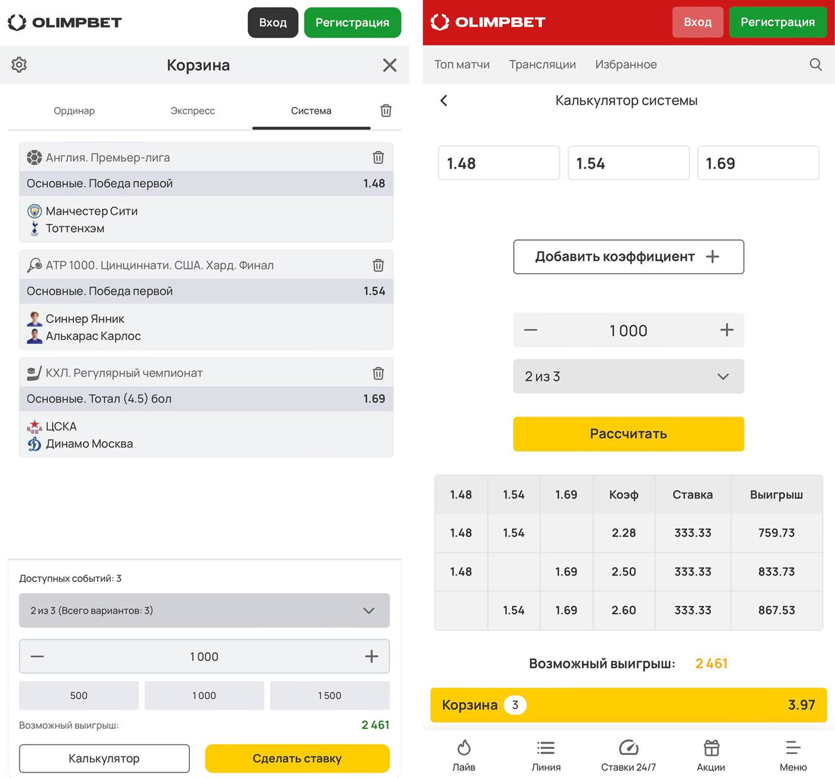 Системой называется ставка из экспрессов, имеющая определенные параметры. В случае с вариантом 2/3, в купон добавляется 3 исхода, а выигрыш доступен при верном прогнозировании как минимум 2. В купон системы, как и экспресса, нельзя добавлять события из одного матча, только из разных игр.
