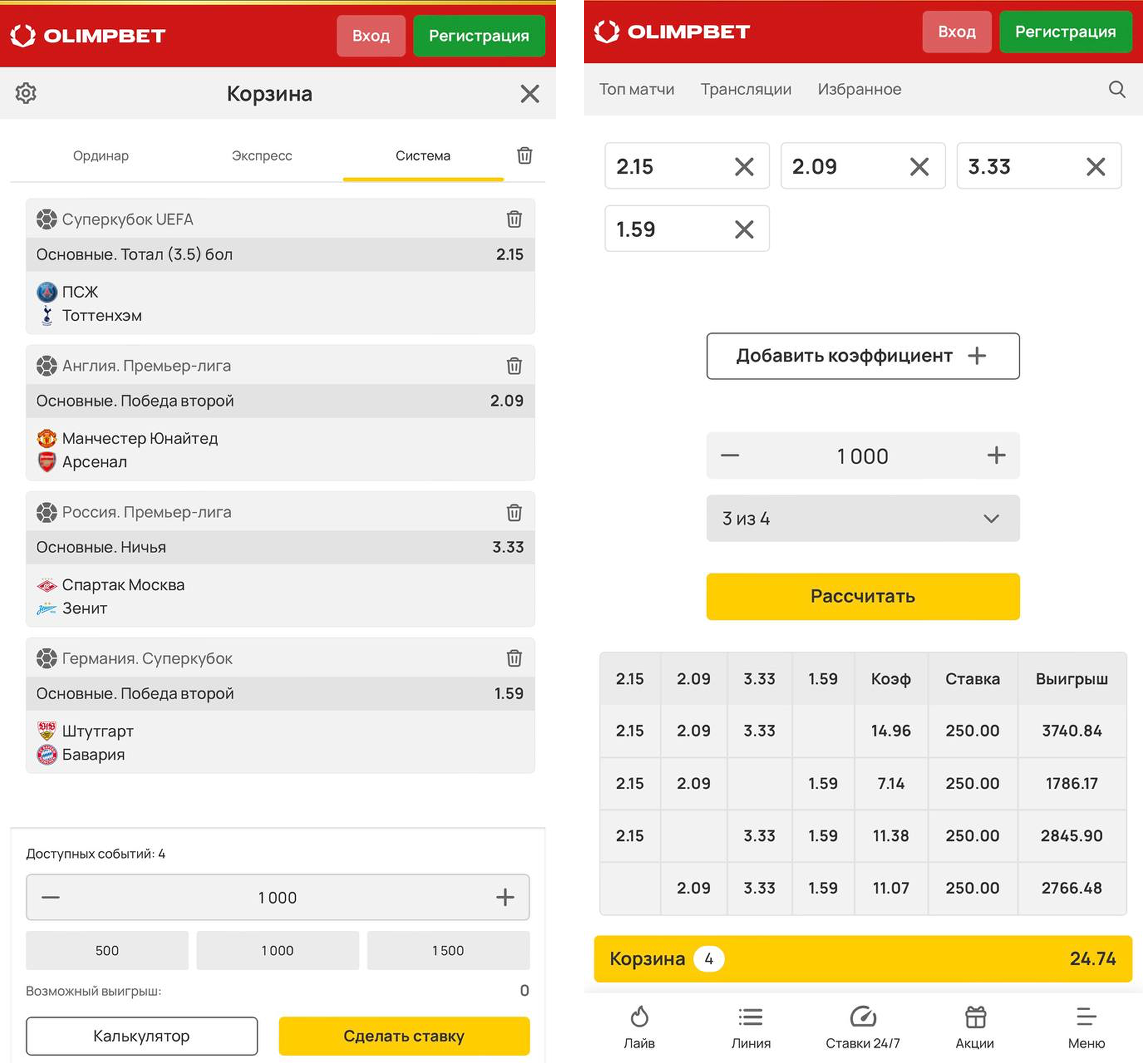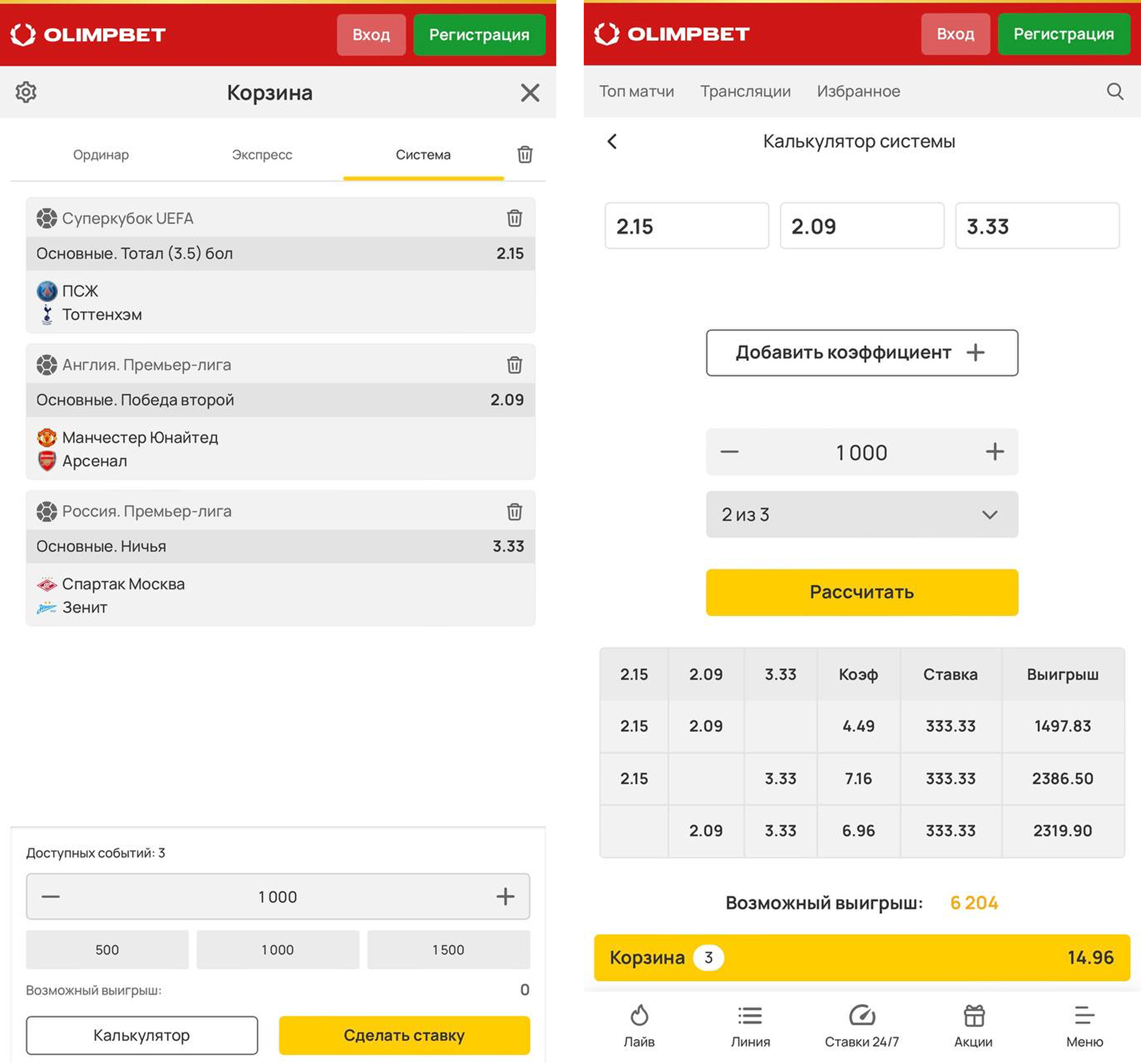 Ниже видно, как системный калькулятор в БК OLIMPBET рассчитал потенциальный выигрыш при совпадении всех 3 событий. Чтобы подсчитать возможные сценарии для выплат нужно перейти в раздел «Калькулятор».